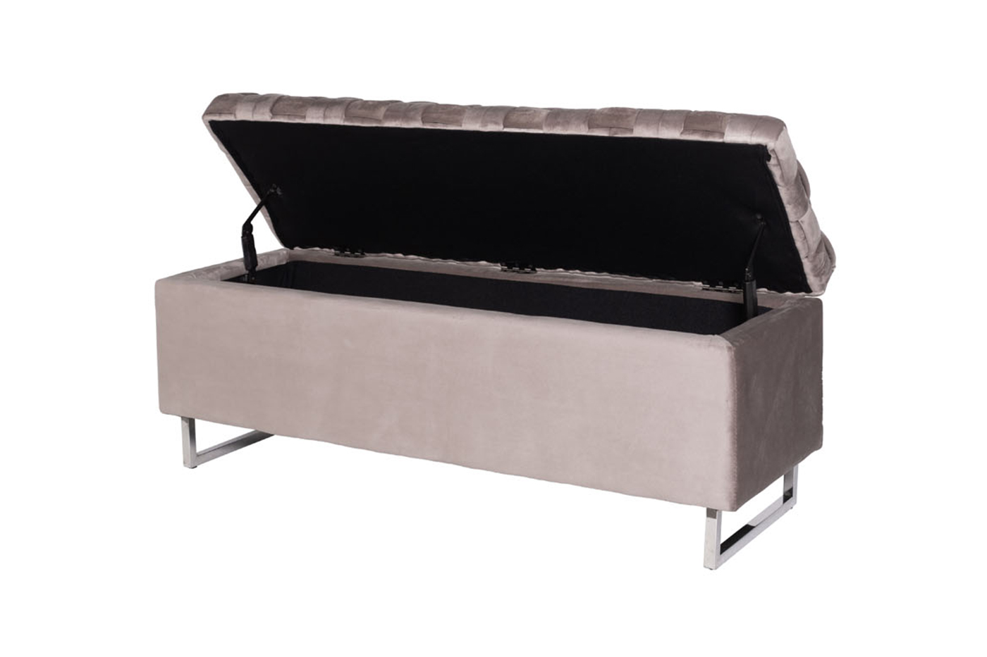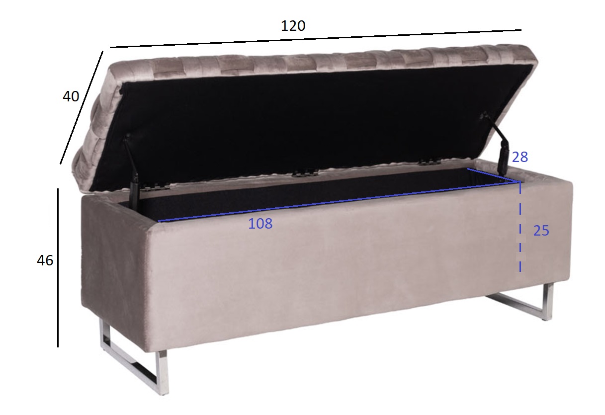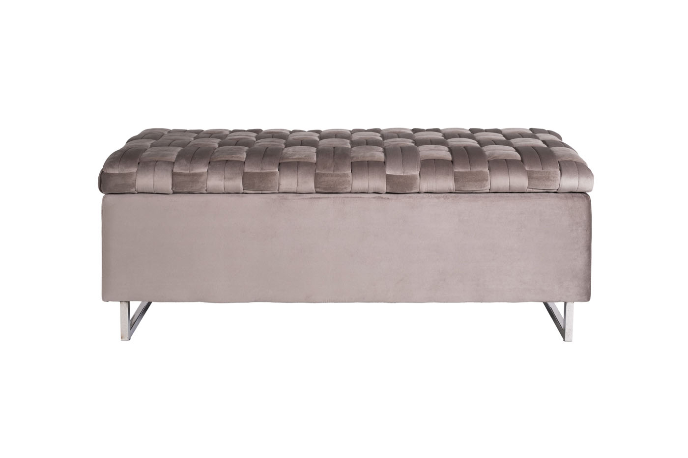 Функциональная банкетка с отсеком для хранения объемом 108*28*25см с интересной отделкой сиденья из плетеных лент ткани с наполнителем ППУ внутри. Нейтральный серо-бежевый цвет велюра c опорами из нержавеющей стали и удобство дают возможность вписать такой предмет мебели в разнообразные варианты интерьера с разным функционалом - и для прихожей, и для спальни