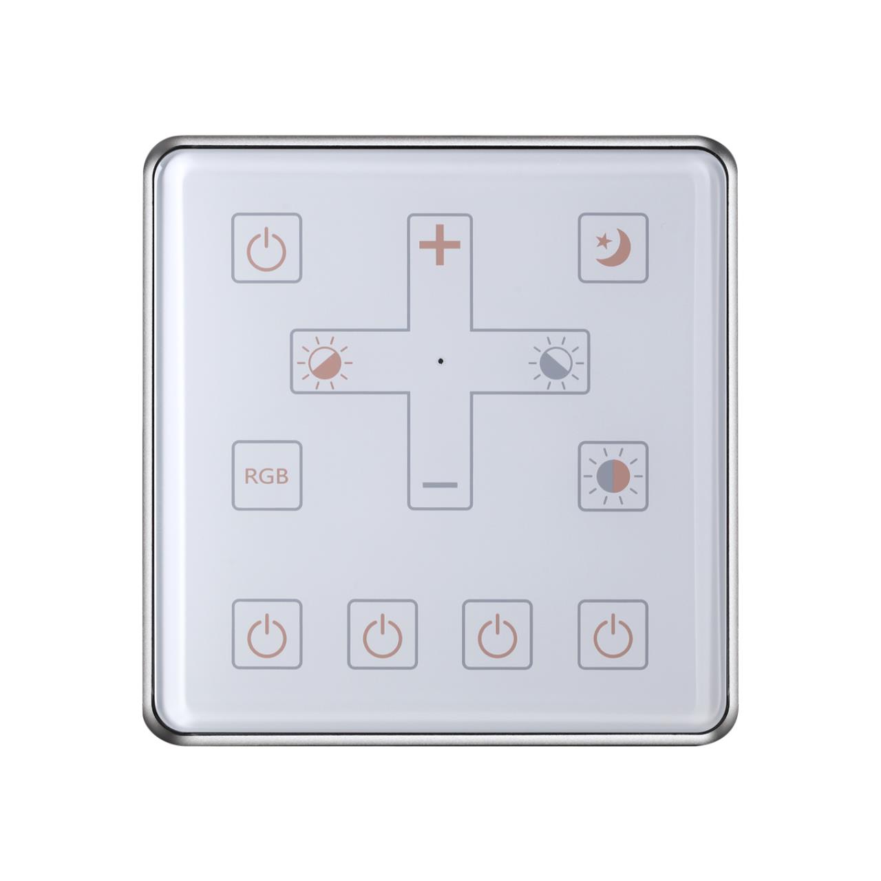 Настенная панель позволяет задавать до четырёх групп освещения, изменять яркость и цветовую температуру светильников на модульной системе GLAT.