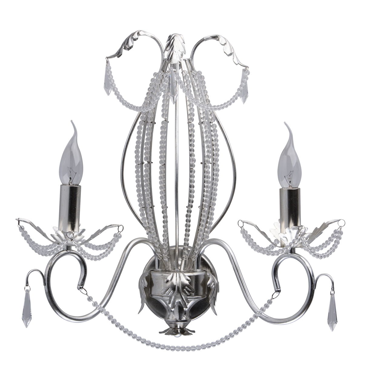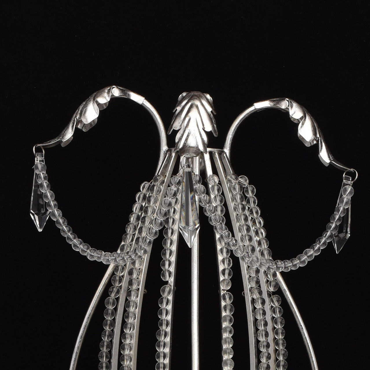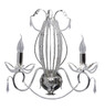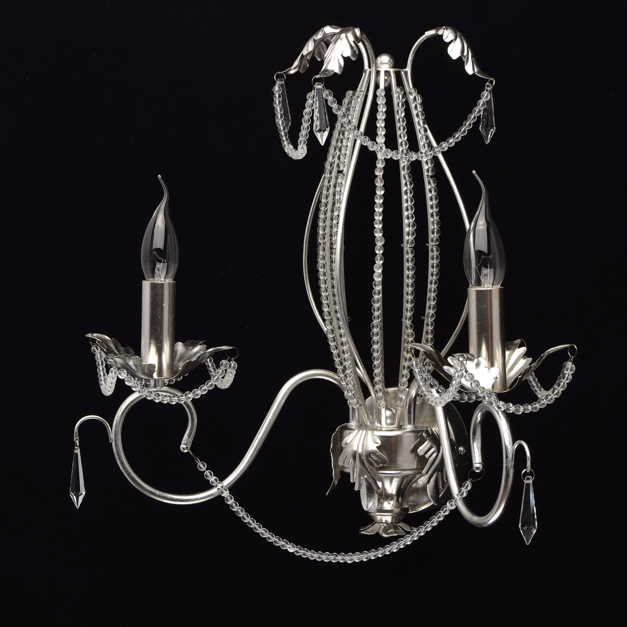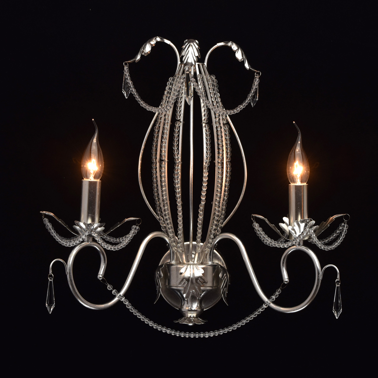 Основание настенного бра выполнено из металла и покрыто сусальным серебром. Светильник декорирован бусами из прозрачного хрусталя и хрустальными подвесками формы капля.