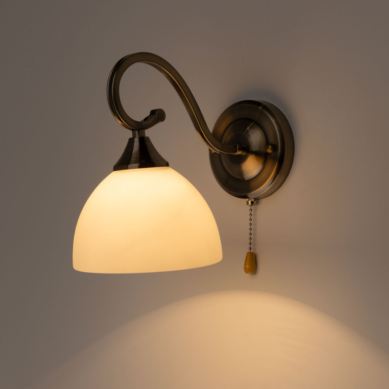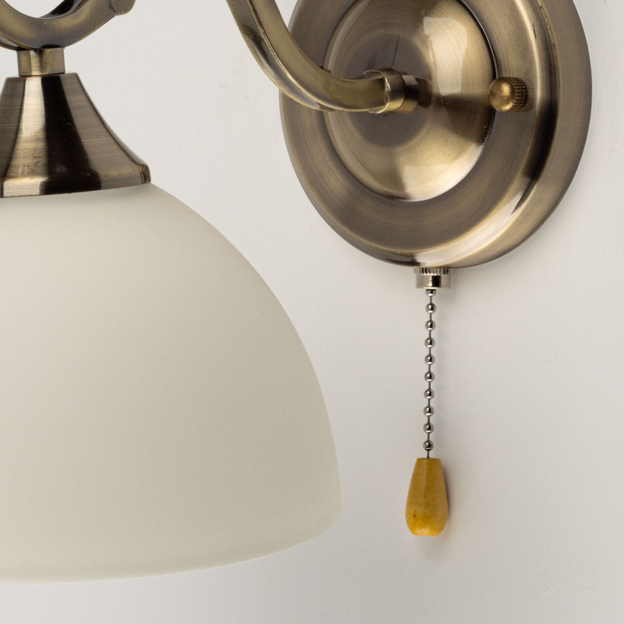 Металлическое основание настенного бра гальванизировано в цвет античной бронзы. Светильник декорирован стеклянным плафоном, отлитым в сложную форму и окрашенным в белый цвет изнутри.