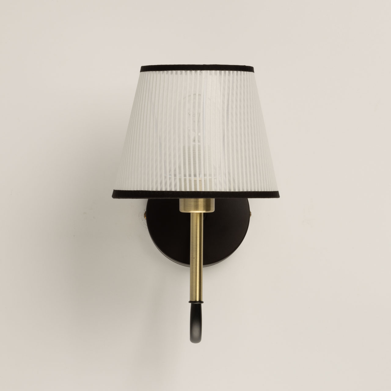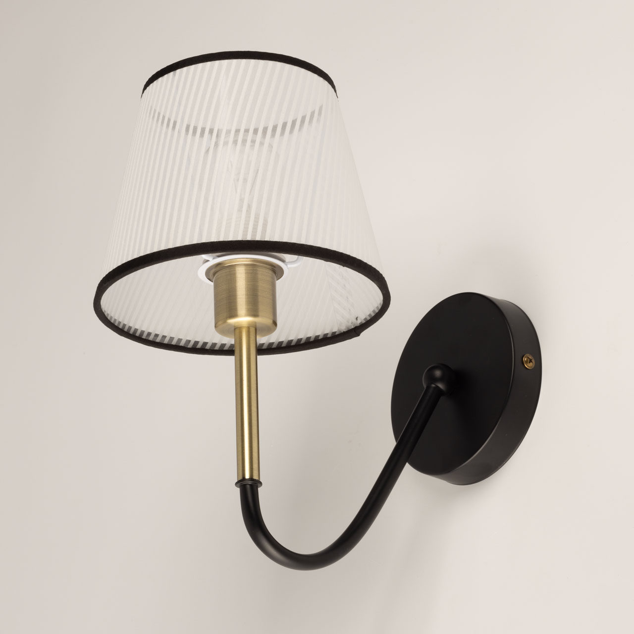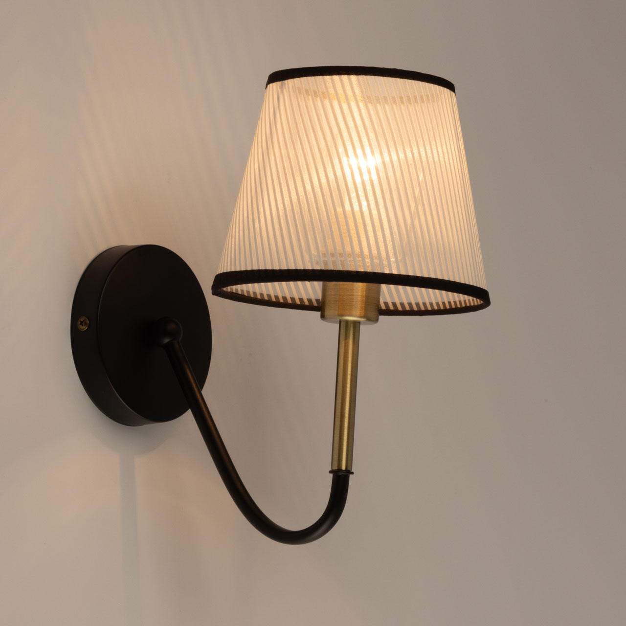 Основание бра выполнено из металла и окрашено в черный цвет, отдельные элементы гальванизированы в цвет античной бронзы. Традиционный источник света закрыт белым тканевым абажуром с линейным рисунком и имеет внутри термостойкий акрил. Края абажура отделаны черным кантом и прошиты.