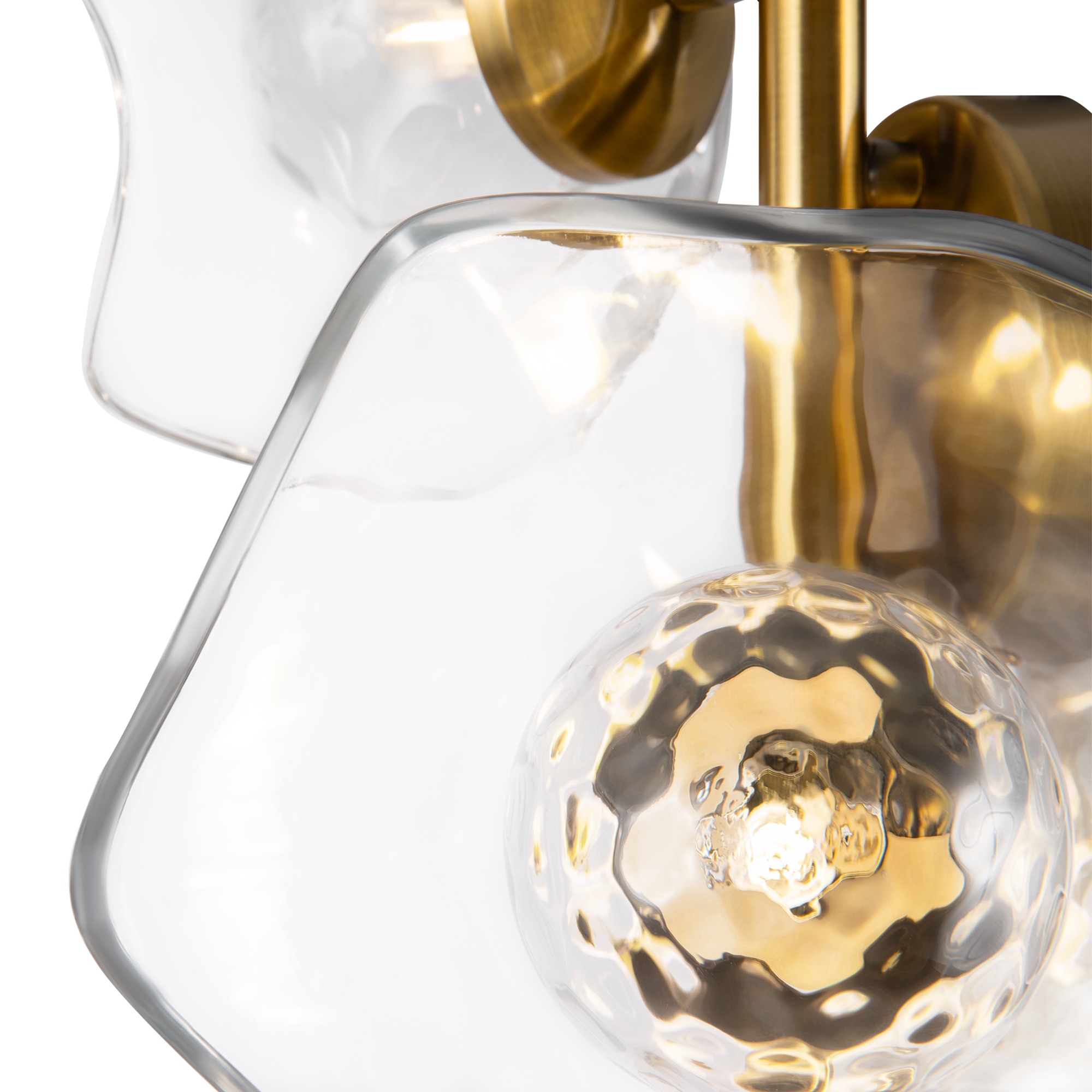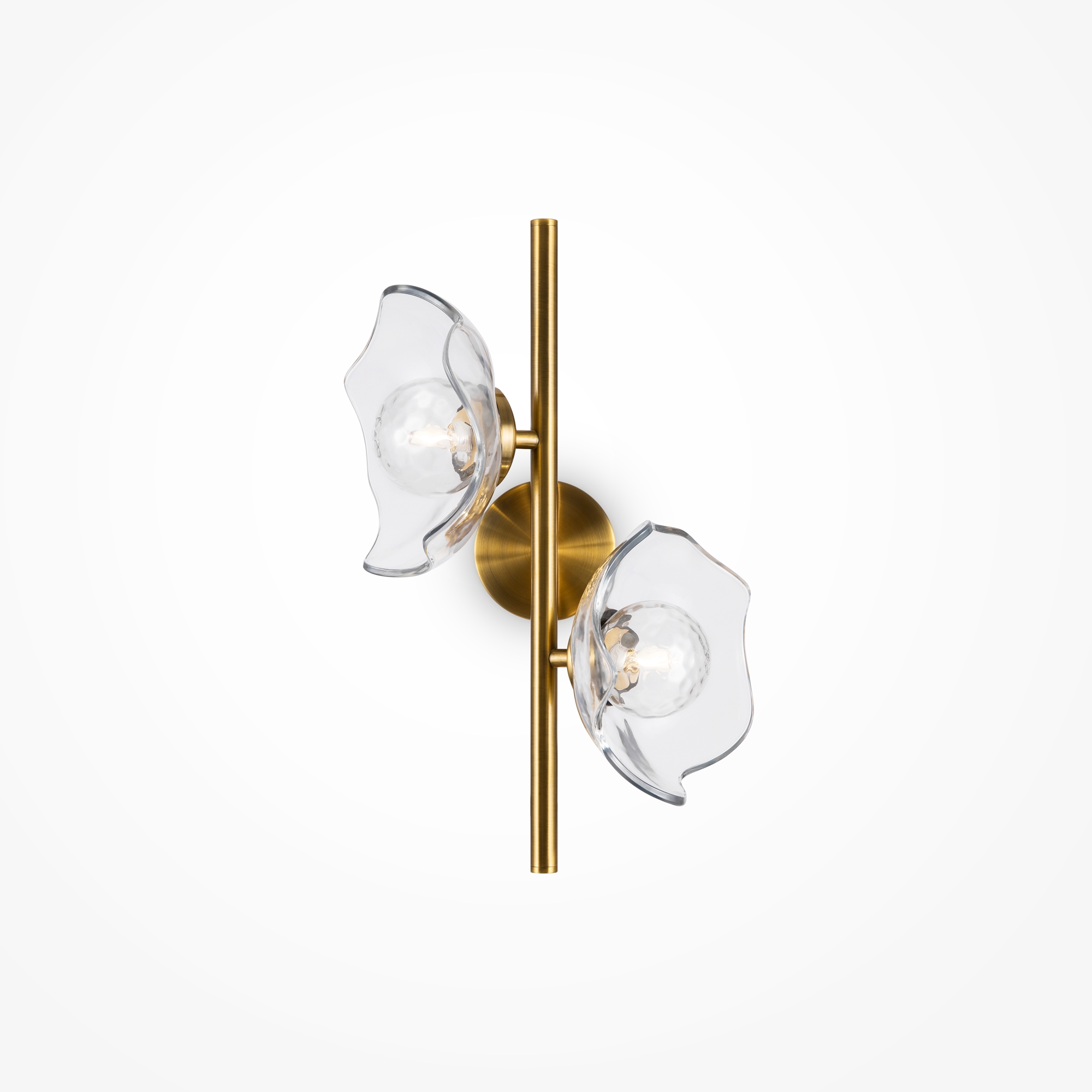 Арматура - металл, цвет - латунь. Плафоны-соцветия из литого стекла в плавных формах. Эффектные световые блики на плавных рельефах плафона. Источник света - лампа с цоколем G9.