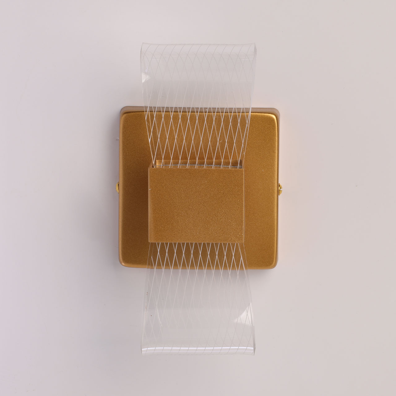 Металлическое основание настенного бра окрашено в матовое золото. Светодиодные источники света закрыты прозрачным акрилом.