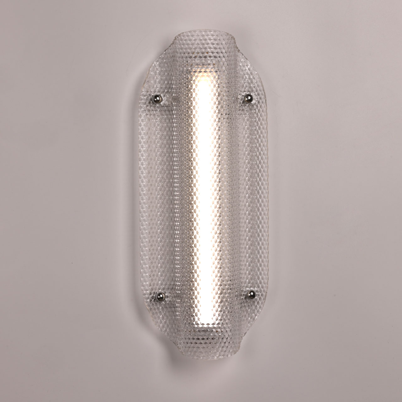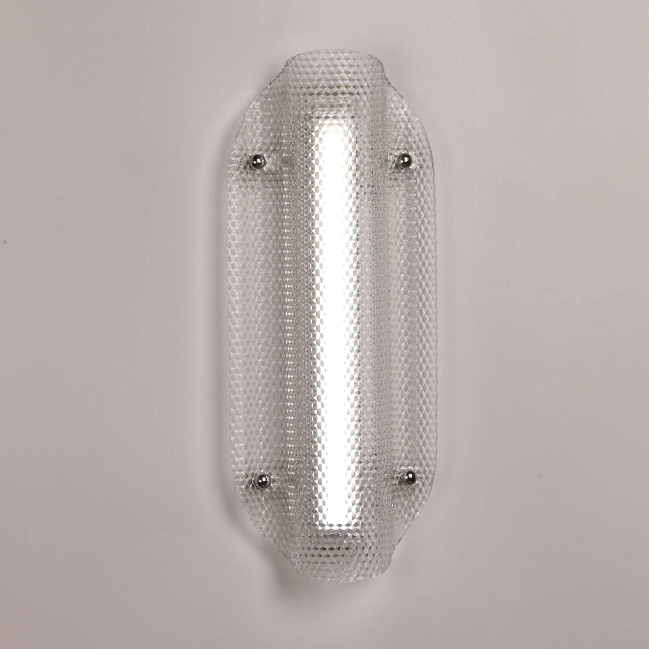 Металлическое основание настенного бра окрашено в цвет перламутрового серебра. Плафон выполнен из прозрачного фактурного литьевого акрила.
