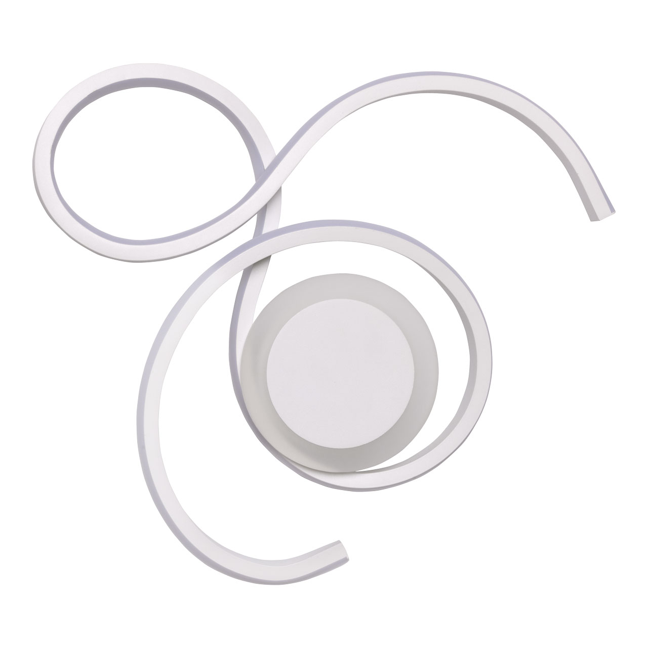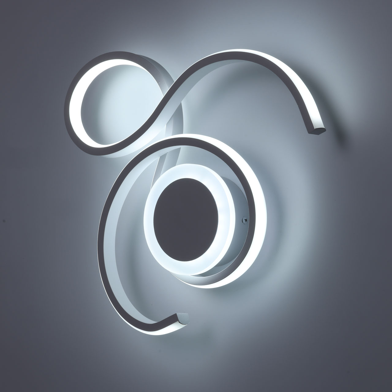 Металлическое основание потолочной люстры окрашено в белый цвет. Корпус плафона выполнен из сплава алюминия и окрашен в цвет основания. Светодиодные источники света закрыты белым силиконом и матовым акрилом.