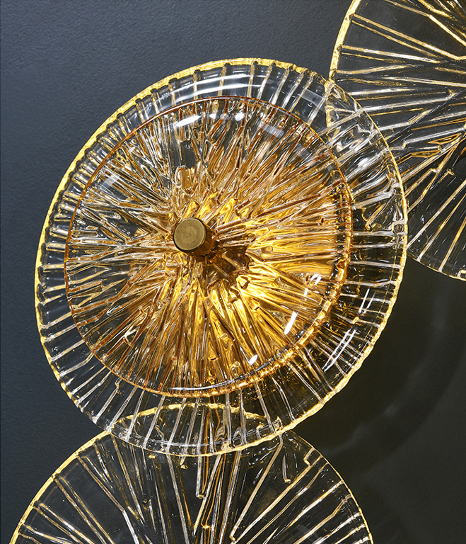 Настенный светильник Delight Collection OM2033-4 gold из четырёх больших круглых элементов и двух поменьше. Элементы из стекла с фактурным рисунком. Металлические части золотого цвета.