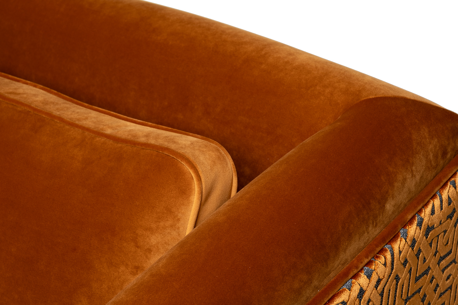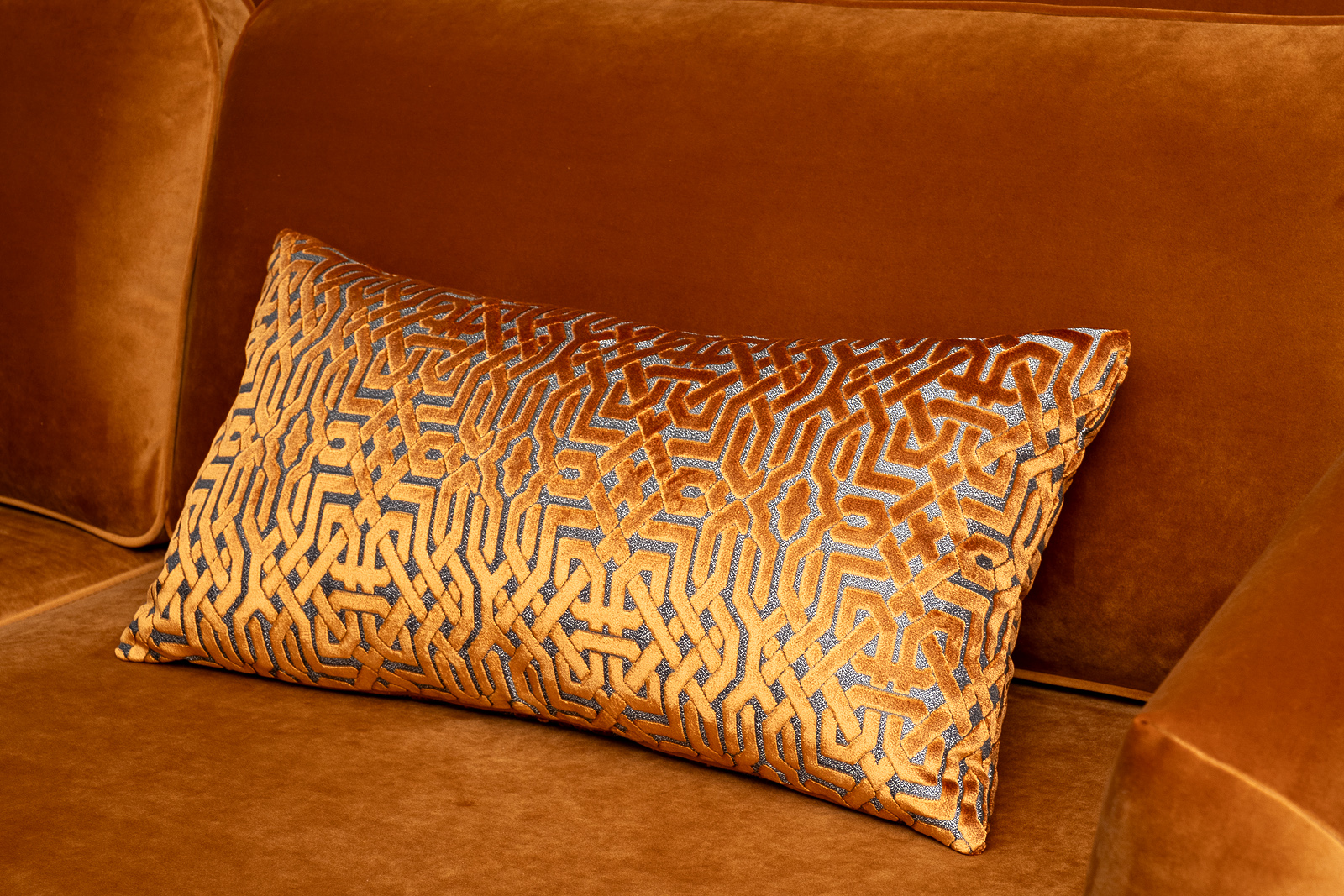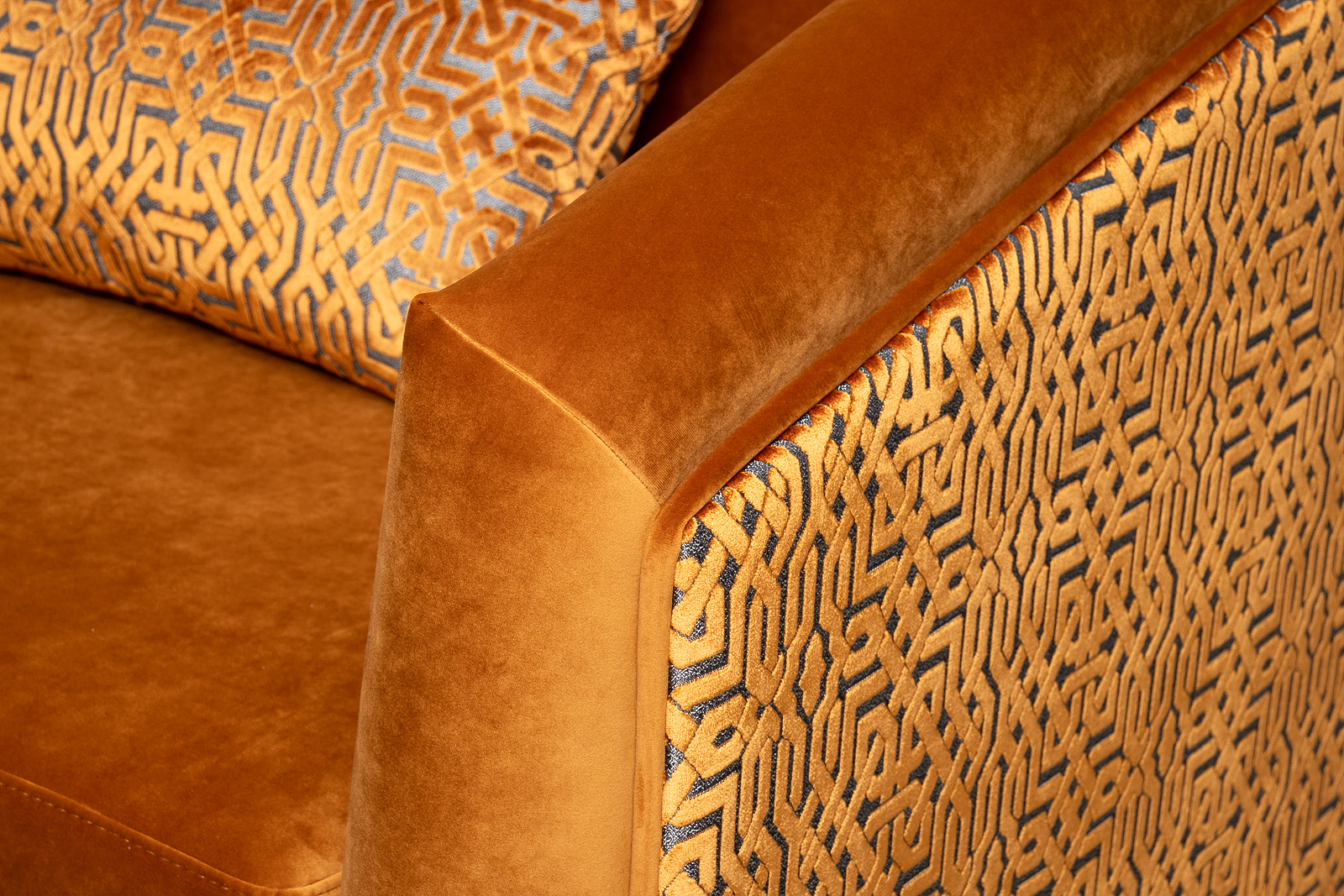 Деревянные опоры, высота 80мм. Образец на фото выполнен в тканях Paddington31G(основная)+Lattice ORANG(задняя часть дивана+прямоугольные декоративные подушки).Передние опоры золото.