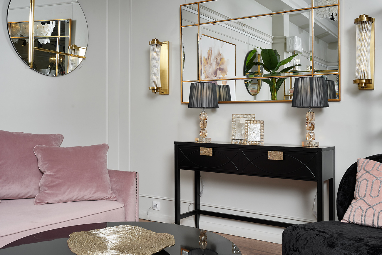 Дизайнерская консоль в стиле ар-деко - авторская разработка студии Garda Decor. Черный матовый фасад украшен объемным дугообразным декором и широкими рельефными ручками золотого цвета (глянцевое золото). Два выдвижных ящика прекрасно подойдут для хранения щеток, косметики и прочих мелочей. Тонкие ножки придают конструкции легкость и изящество. Эксклюзивная консоль станет гармоничным дополнением интерьера прихожей, спальни или гостиной. На нашем сайте представлены комод арт.151SV-00001, ТВ-тумба арт.151SV-00005 и прикроватная тумба арт.151SV-00008
