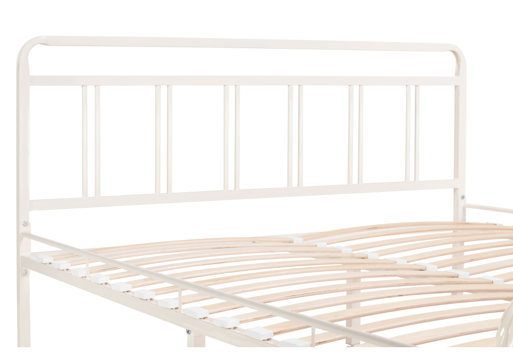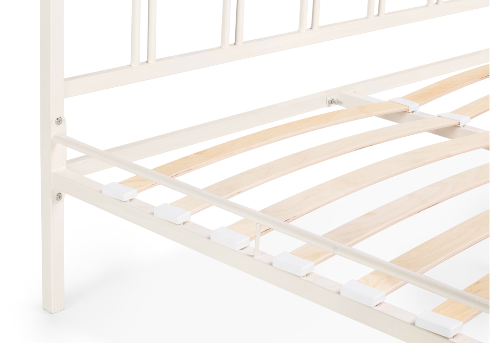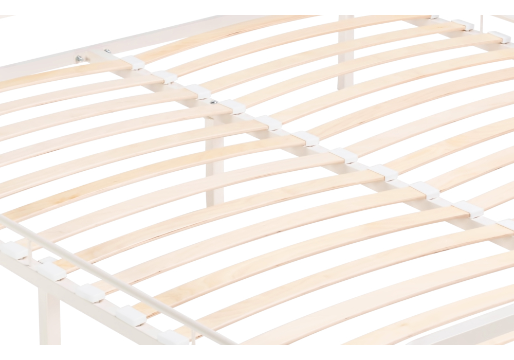 Материал каркаса - Металл; Материал ножек - Металл; Ортопедическое основание - в комплекте; Материал ортопедического основания - с деревянными ламелями; Цвет каркаса - Белый; Цвет ножек - Белый; Ширина - 162; Глубина - 205; Высота - 90; Размер спального места - 160 х 200; Длина кровати - 205; Ширина кровати - 162; Высота изножья - 46; Высота изголовья - 90;