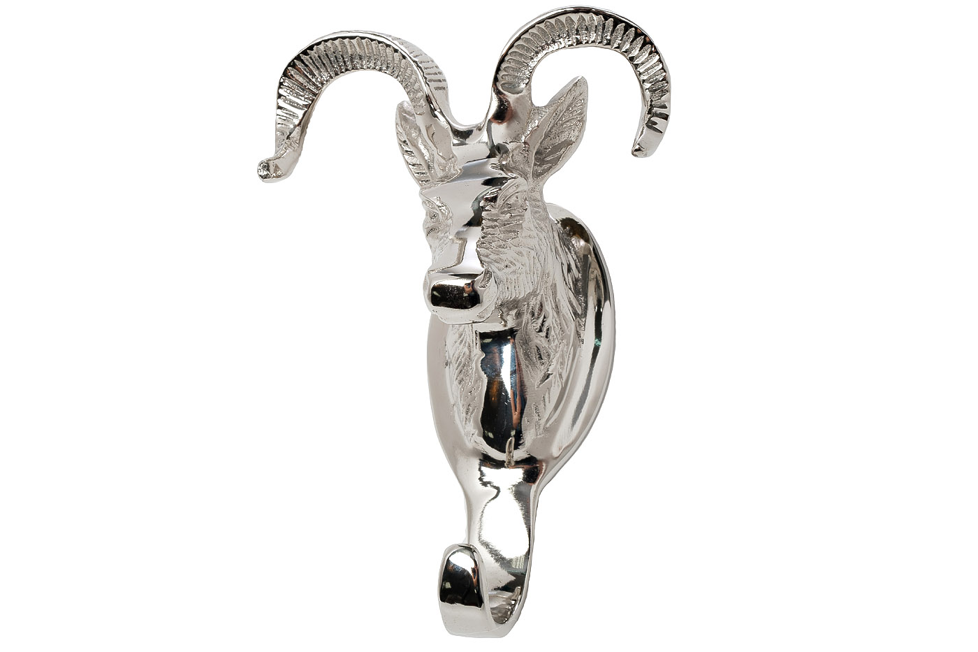 Оригинальный настенный крючок в виде головы горного барана с витыми рогами станет стильным акцентом в интерьере прихожей, оформленной в стиле неоклассика. Крючок настенный металлический отличается прочностью и долговечностью, а покрытие под хром придает ему респектабельный внешний вид. Крючок настенный хром – это не только функциональный предмет, но и изящный элемент декора, подчеркивающий безупречный вкус владельца дома.