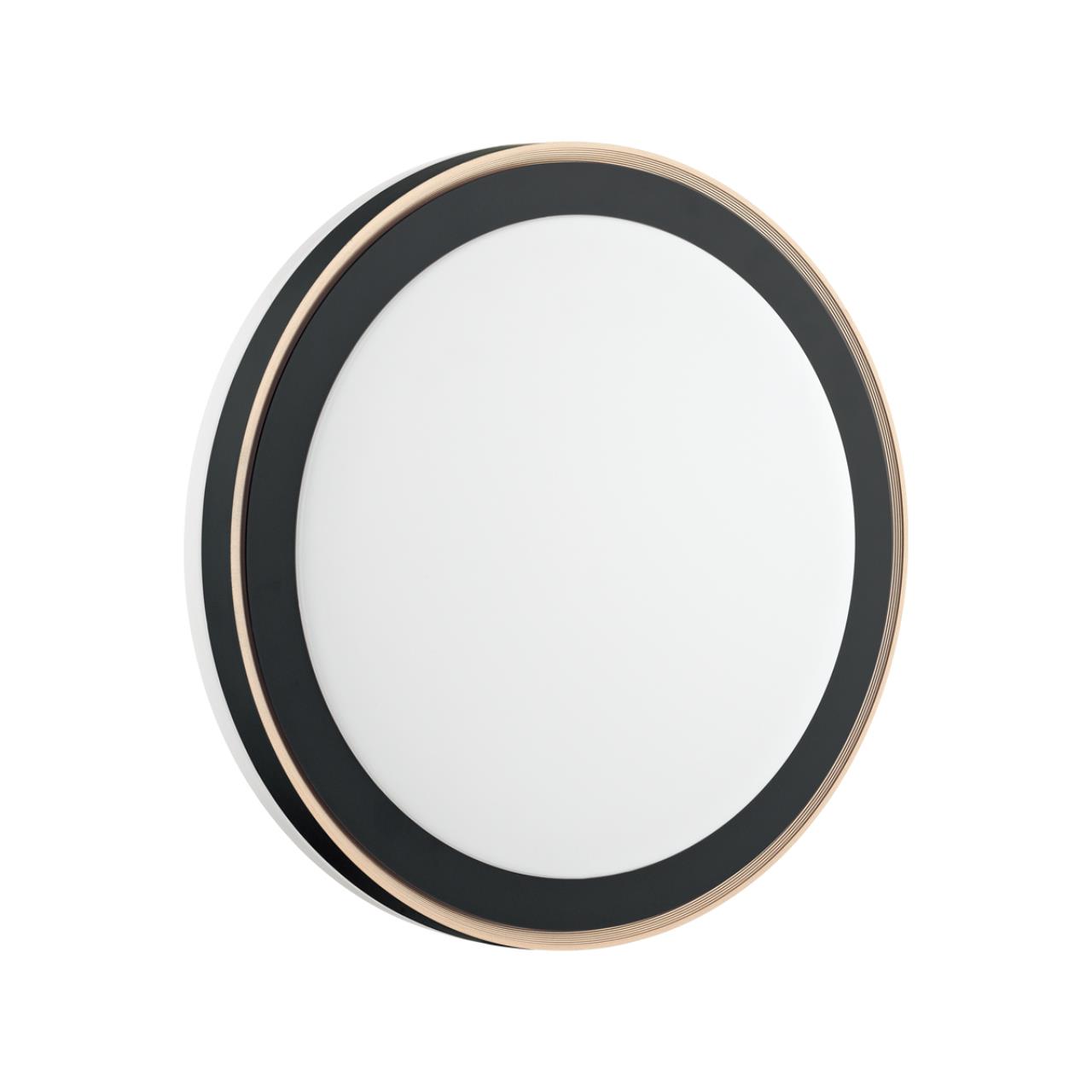 Светильник 7620/DLN линии AKUNA состоит из металлического основания (базы) и пластикового рассеивателя. Материал рассеивателя — качественный акрил белого цвета с матовой поверхностью без текстуры. Пластик обеспечивает светильнику равномерное рассеивание и хорошее светопропускание. Форма плафона — круглая, декорирована ободом из пластика черного цвета и кантом медного цвета. На боковой части плафона имеется светящаяся зона, близкая к поверхности, которая красиво подсвечивает потолок и стену. Степень защиты IP43 позволяет использовать светильник в определенных зонах влажных помещений. В комплект входит LED-модуль с линзами мощностью 48 Вт, которая соответствует лампе накаливания 515 Вт, а также переключатель температуры цвета (ССT) на драйвере, с помощью которого осуществляется изменение цветовой температуры 3000/4000/6000К и переход светильника в режим теплого/белого/холодного света. Для установки необходимого режима рекомендуется использовать удлиненный тонкий предмет типа небольшой отвертки.