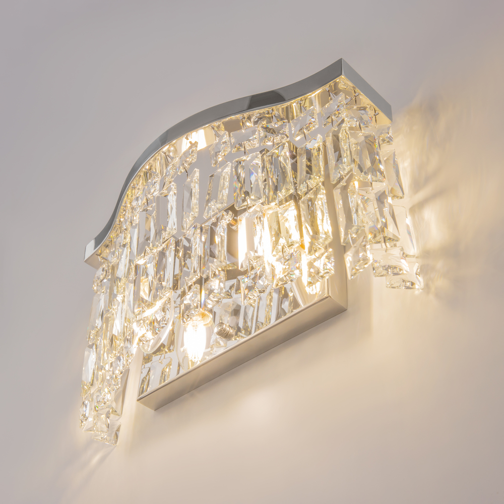 Плафоны выполнены из кристаллов различных форм, которые плотным занавесом свисают с фигурного основания. При включении светильника благодаря необычному дизайну они дают красивые блики, наполняющие комнату яркими огоньками. Арматура светильников изготовлена из хромированного металла, который отражает свет ламп. Размеры устройства составляют 310 мм х 180 мм, что позволяет легко интегрировать его в любое интерьерное пространство. Модели, входящие в коллекцию Dune DIA005, идеально подойдут для размещения в зоне гостиной, спальни, кабинета или офиса, оформленных в стиле модерн, а также для размещения в зоне барной стойки или острова в столовой, позволяя использовать в тандеме подвесные светильники, потолочные и настенные источники света.