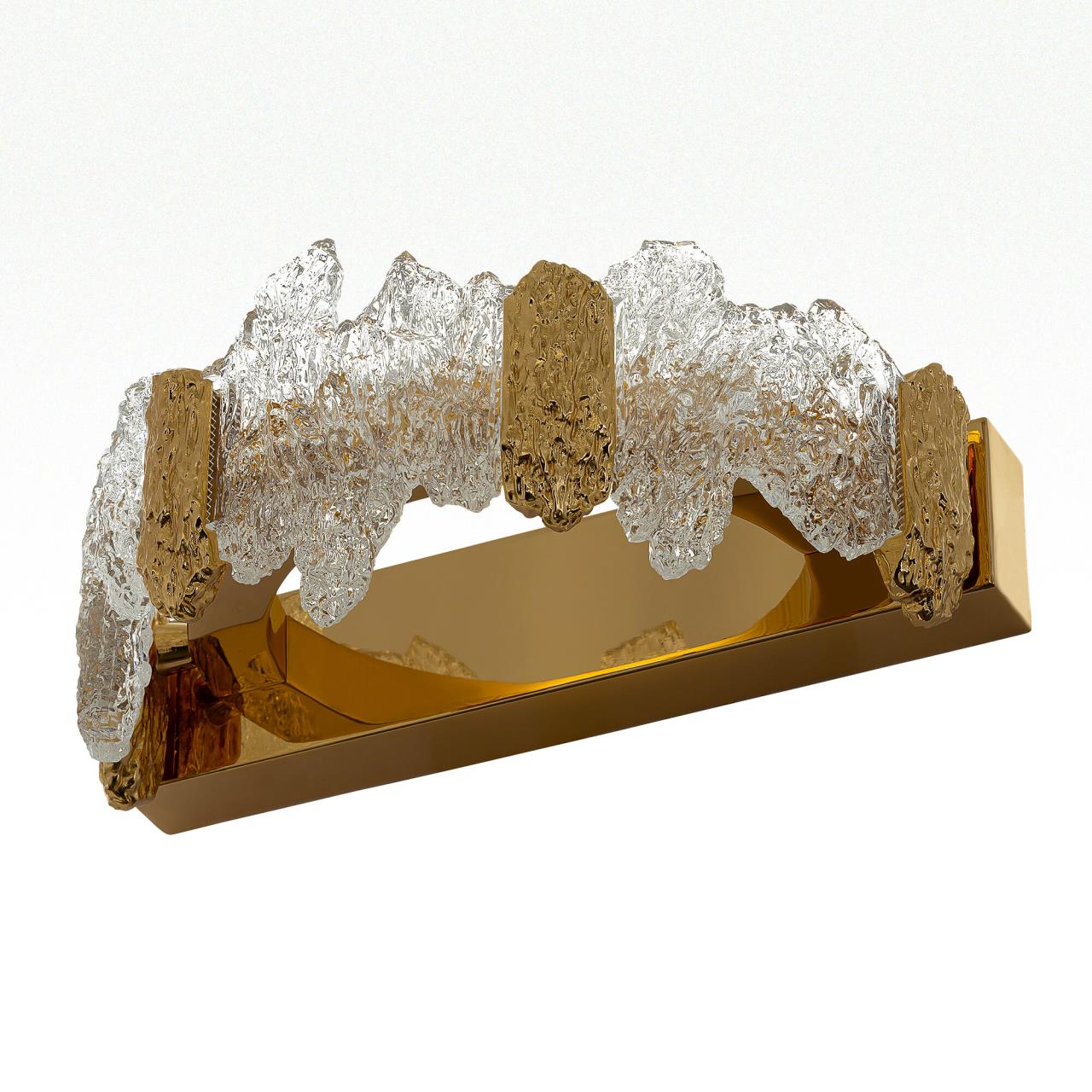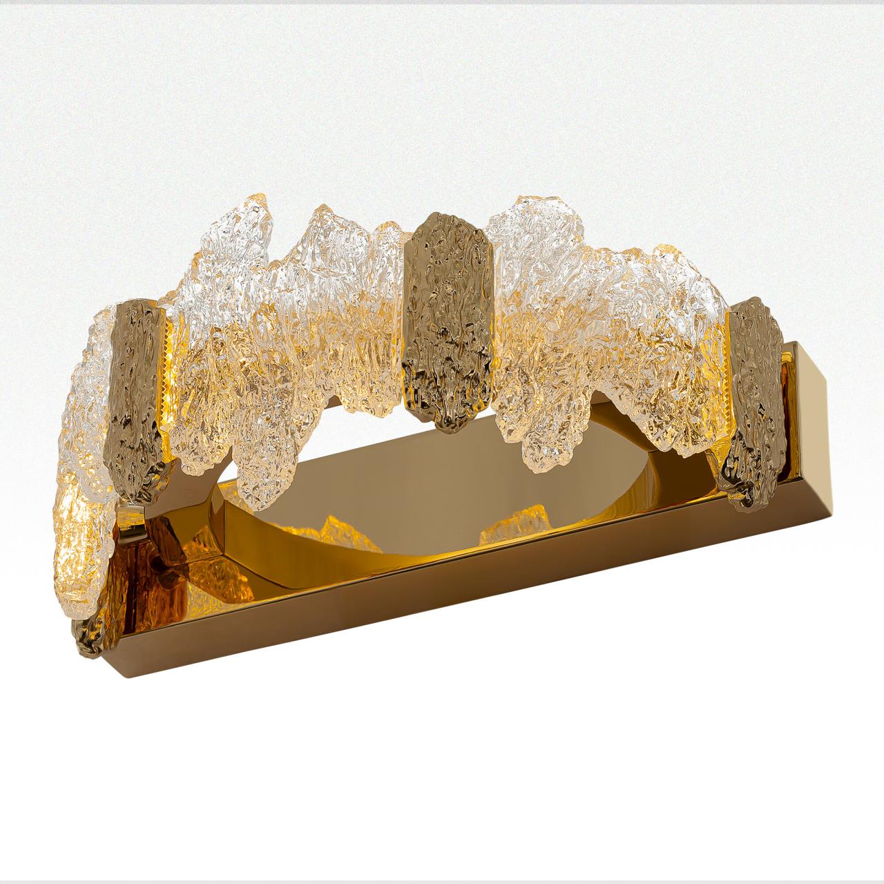Каркас светильника — металлический, роскошного золотистого оттенка. Рассеиватель из оптического полимера имеет оригинальную форму, напоминающую потоки застывшей лавы. Светильник крепится к стене на планку
