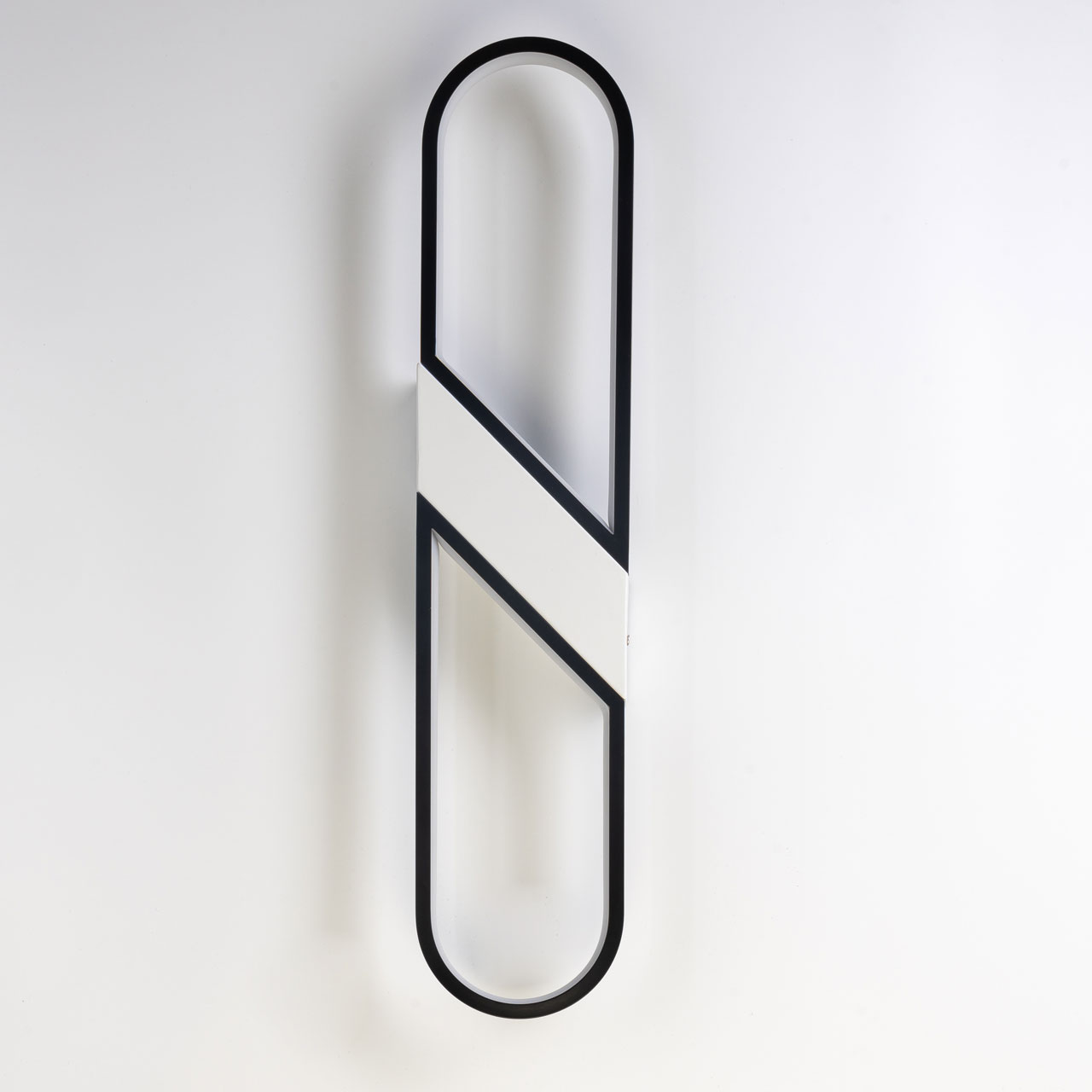 Металлическое основание настенного бра и плафон из сплава алюминия окрашены в черный и белый цвета. Светодиодный источник света закрыт белым матовым силиконом.