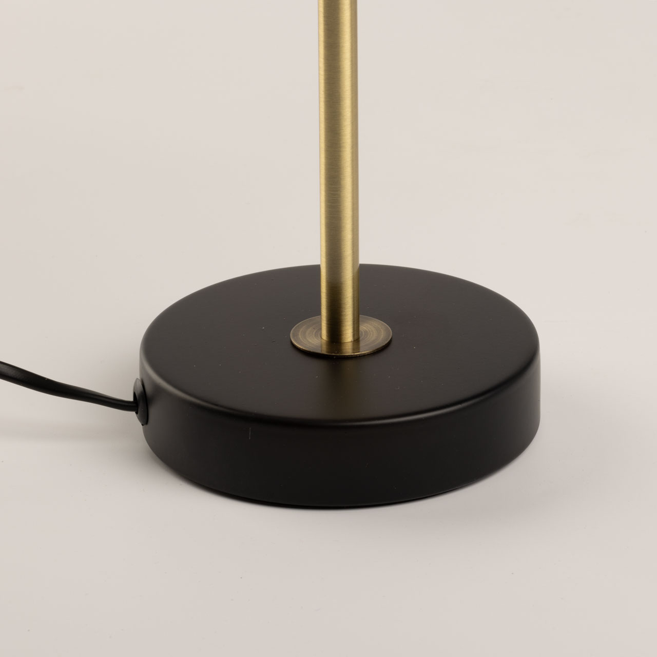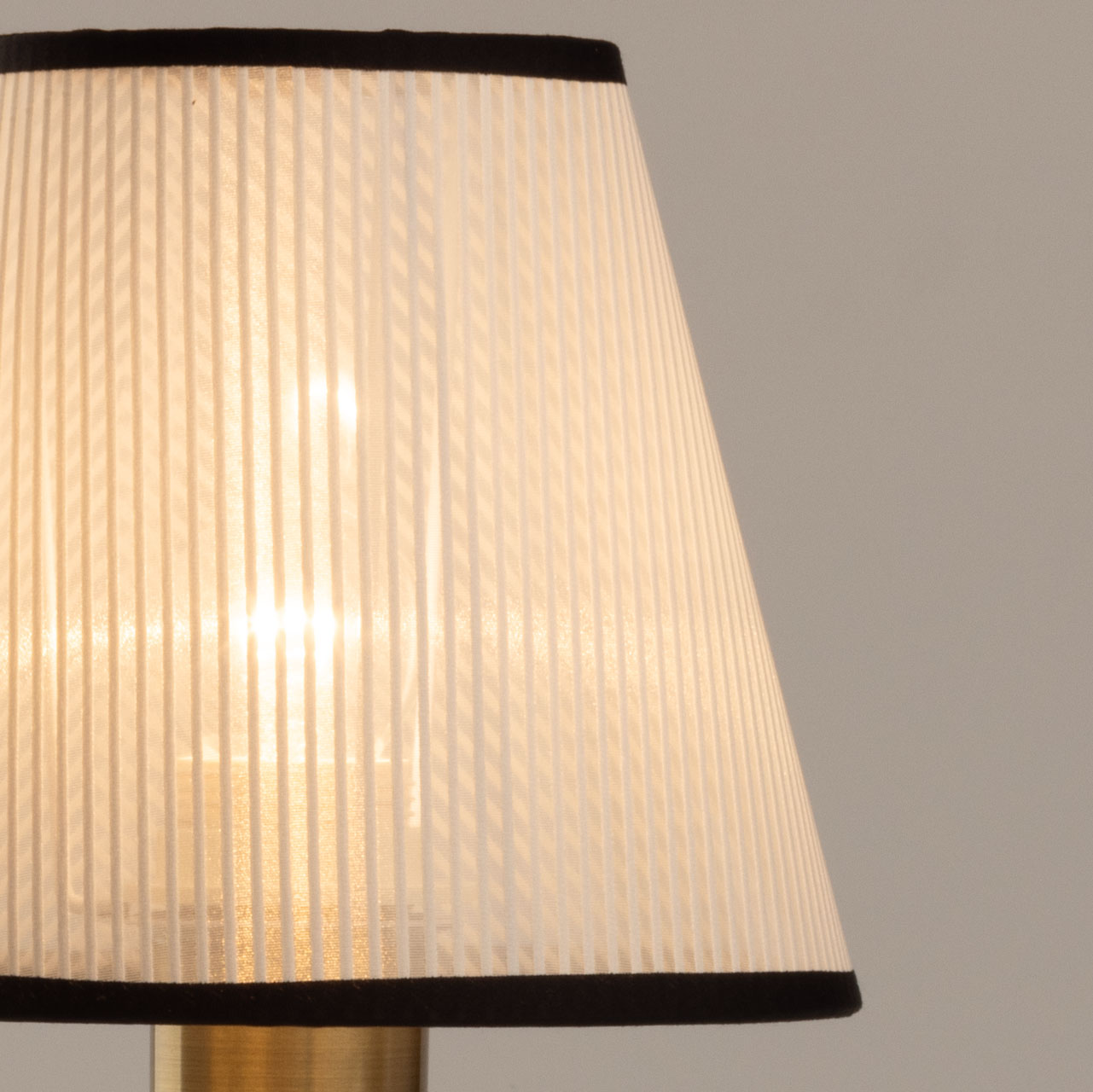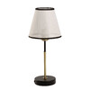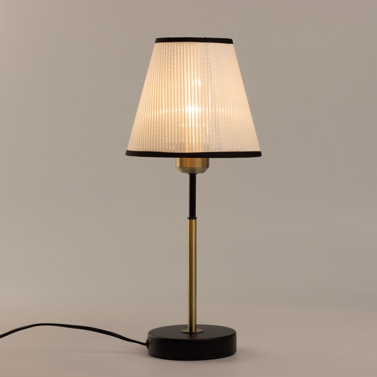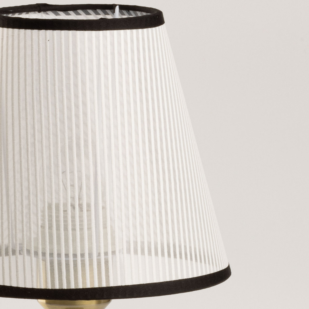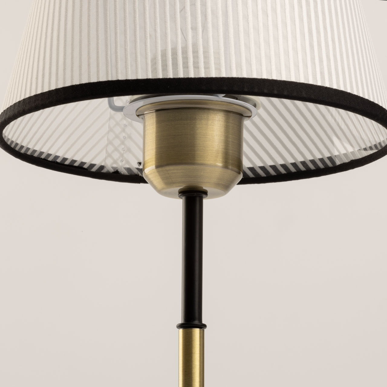 Основание настольной лампы выполнено из металла и окрашено в черный цвет, отдельные элементы гальванизированы в цвет античной бронзы. Традиционный источник света закрыт белым тканевым абажуром с линейным рисунком и имеет внутри термостойкий акрил. Края абажура отделаны черным кантом и прошиты.
