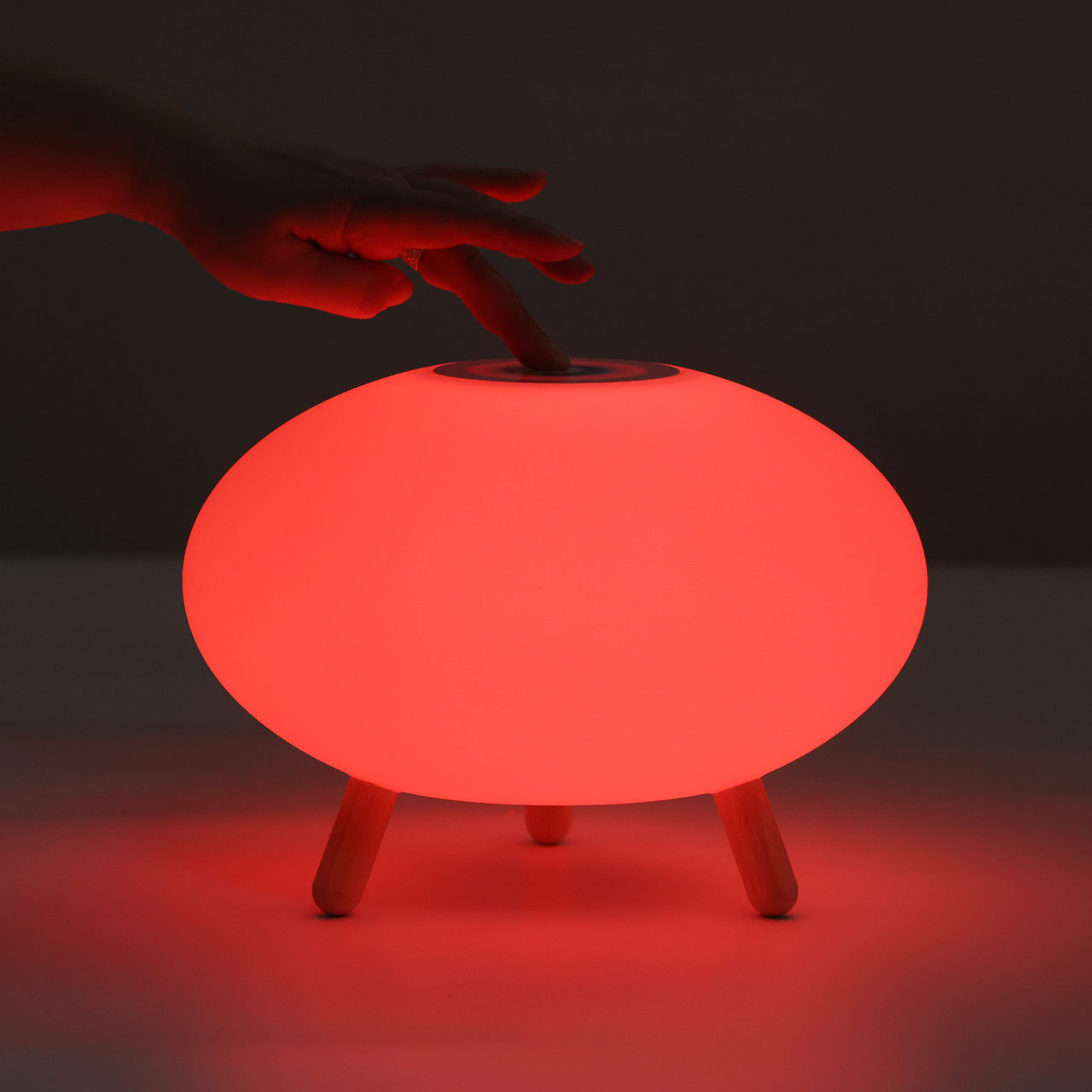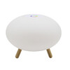 Светодиодный источник света белый, теплый+RGB закрыт белым матовым акрилом.Настольная лампа устанавливается на деревянные ножки цвета светлого дерева.Управление светильником расположены на корпусе плафона. Зарядный кабель USB входит в комплект.