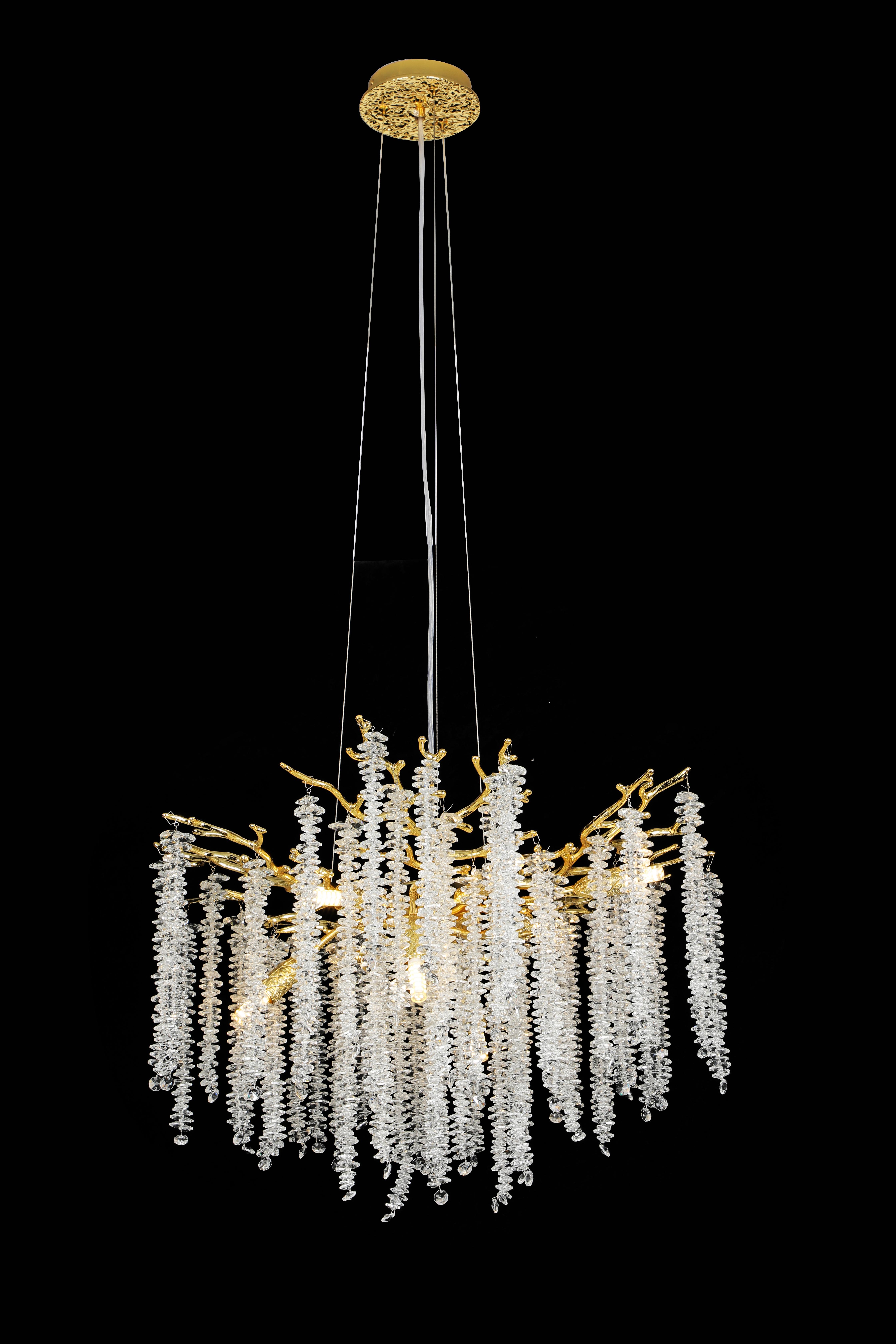 Высота изделия 1500 мм, диаметр 760 мм, что позволяет осветить пространство от 20 до 25 квадратных метров. Количество ламп - 10 штук с цколем G9. Люстра выполнена в элегантном золотом цвете и дополнена элементами из прозрачного хрусталя, который подчеркнёт вашу изысканность и вкус. Металлическая арматура обеспечивает долговечность и устойчивость конструкции, а светодиодные лампы равномерно рассеивают свет, создавая комфортное освещение. Благодаря использованию светодиодных ламп вы сможете значительно сэкономить на электроэнергии, не теряя при этом яркости света.