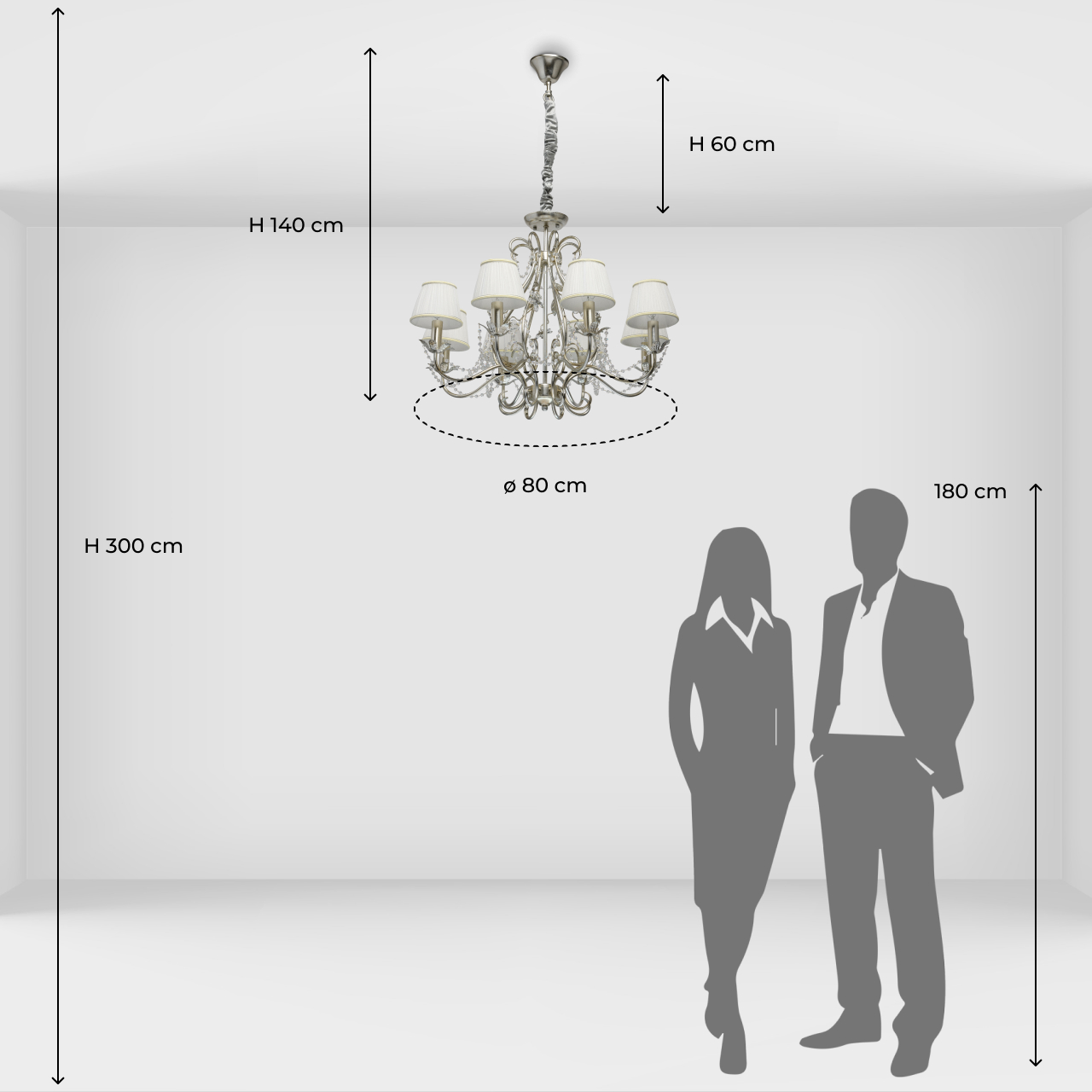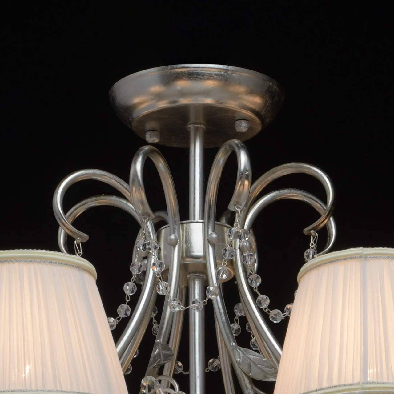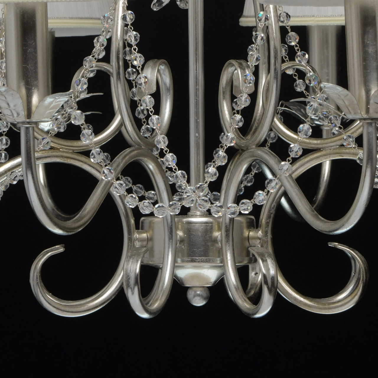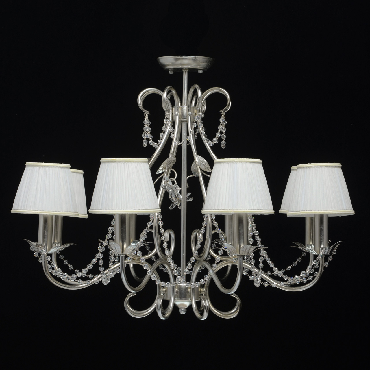 Основание выполнено из металла и покрыто сусальным серебром. Декоративные розетки и декор в виде листьев выполнены по технологии чеканки.Рожки и декоративные элементы выполнены по технологии проката на роликовом станке.Текстильные абажуры белого цвета декорированы кантом сверху и снизу.Декор: хрустальные бусы и хрусталь формы миндаль.