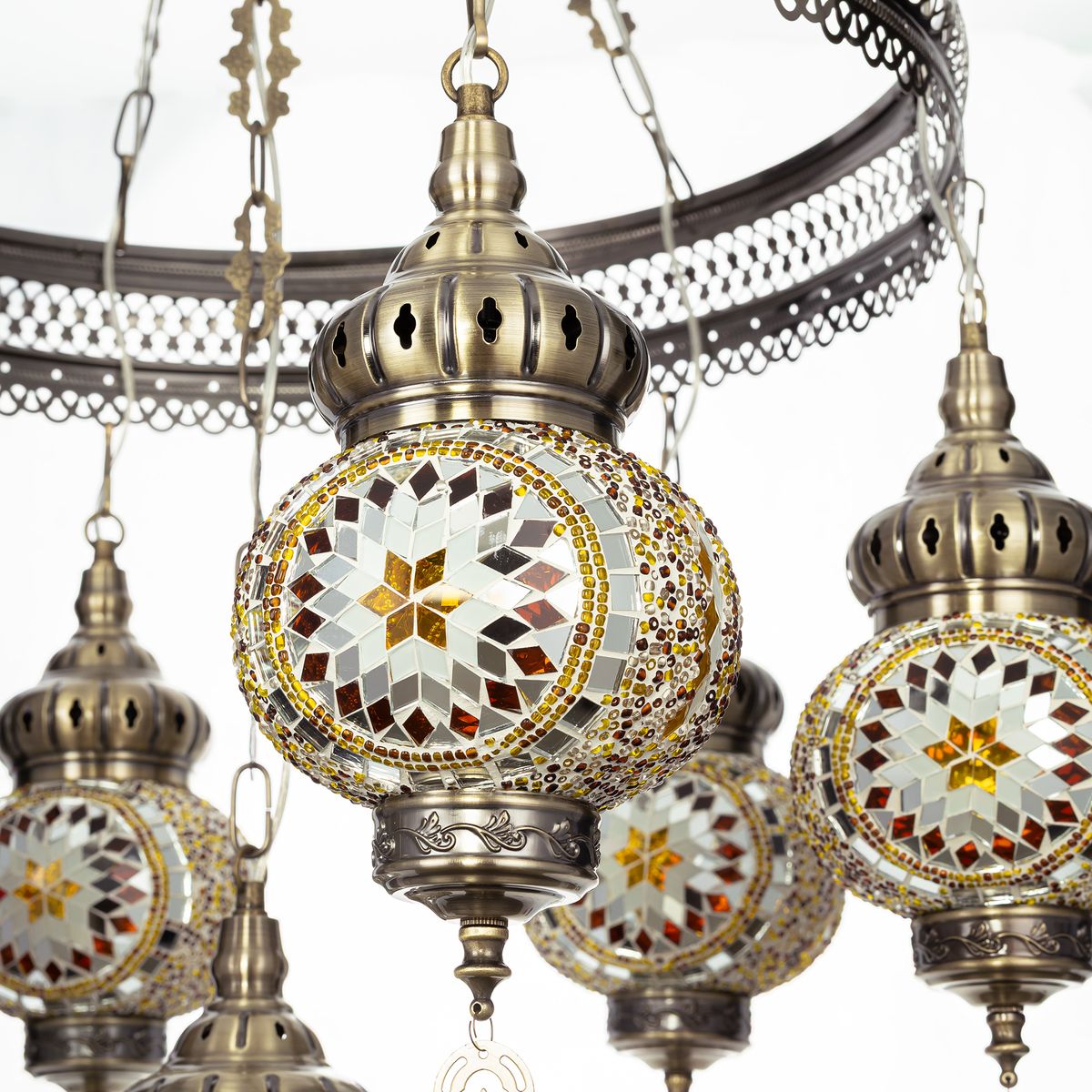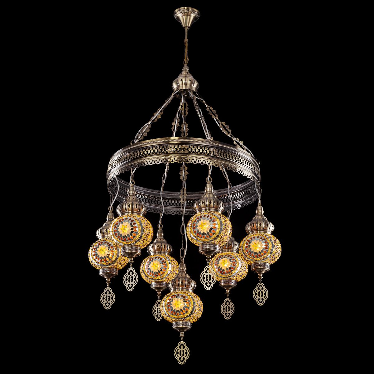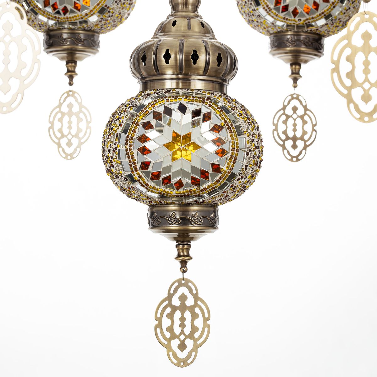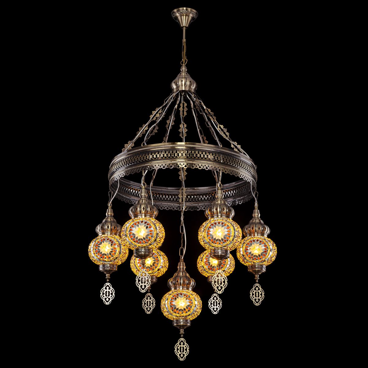Семь подвесных плафонов, выполненных в форме слегка приплюснутых шаров, словно капли меда, застывшие в воздухе. Стеклянная мозаика в оттенках янтаря наполняет пространство теплым, уютным свечением. Металлический каркас благородного бронзового цвета декорирован искусной чеканкой.