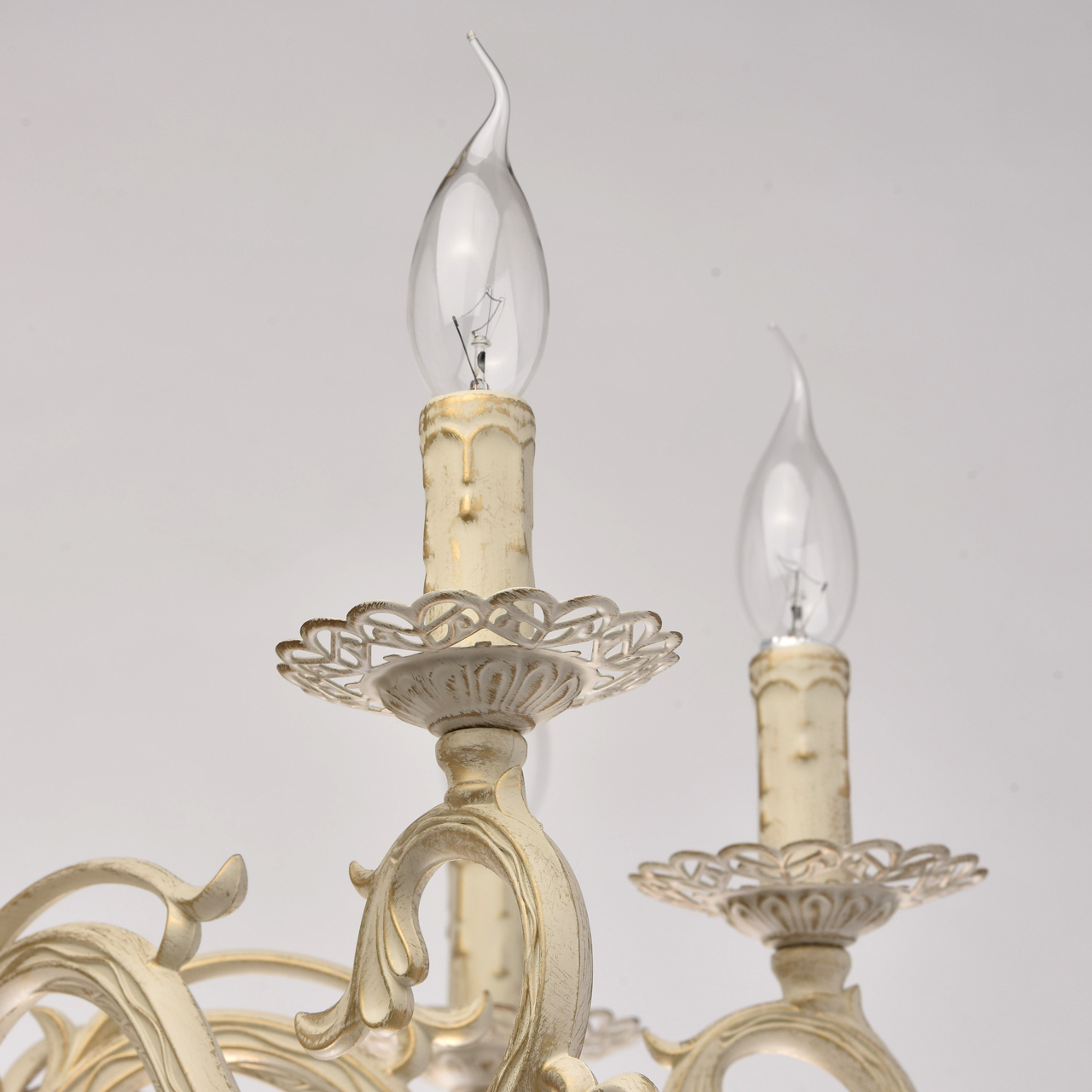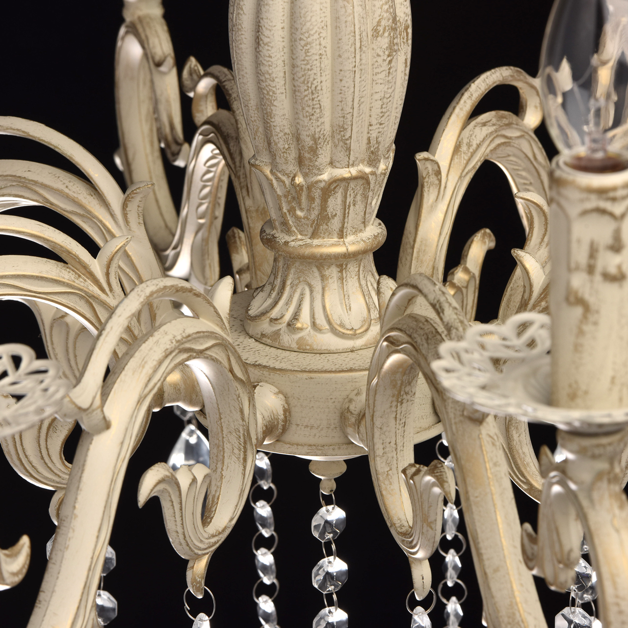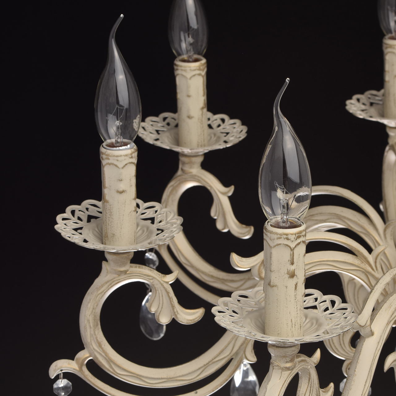 Основание из сплава металлов покрыто в технике хай-лайт: основной слой белой краски патинирован золотом. Короткий подвес 15 см в виде цепи позволяет использовать люстру в комнатах со стандартными потолками. Центральный стержень и рожки выполнены в изящных формах, украшены кружевными розетками. Плафоны отсутствуют, вместо них использованы лампы в форме свечей. Достоверное сходство с канделябром обеспечивают надпатронники с эффектом оплавленного воска. Венчают композицию россыпи из прозрачного хрусталя.