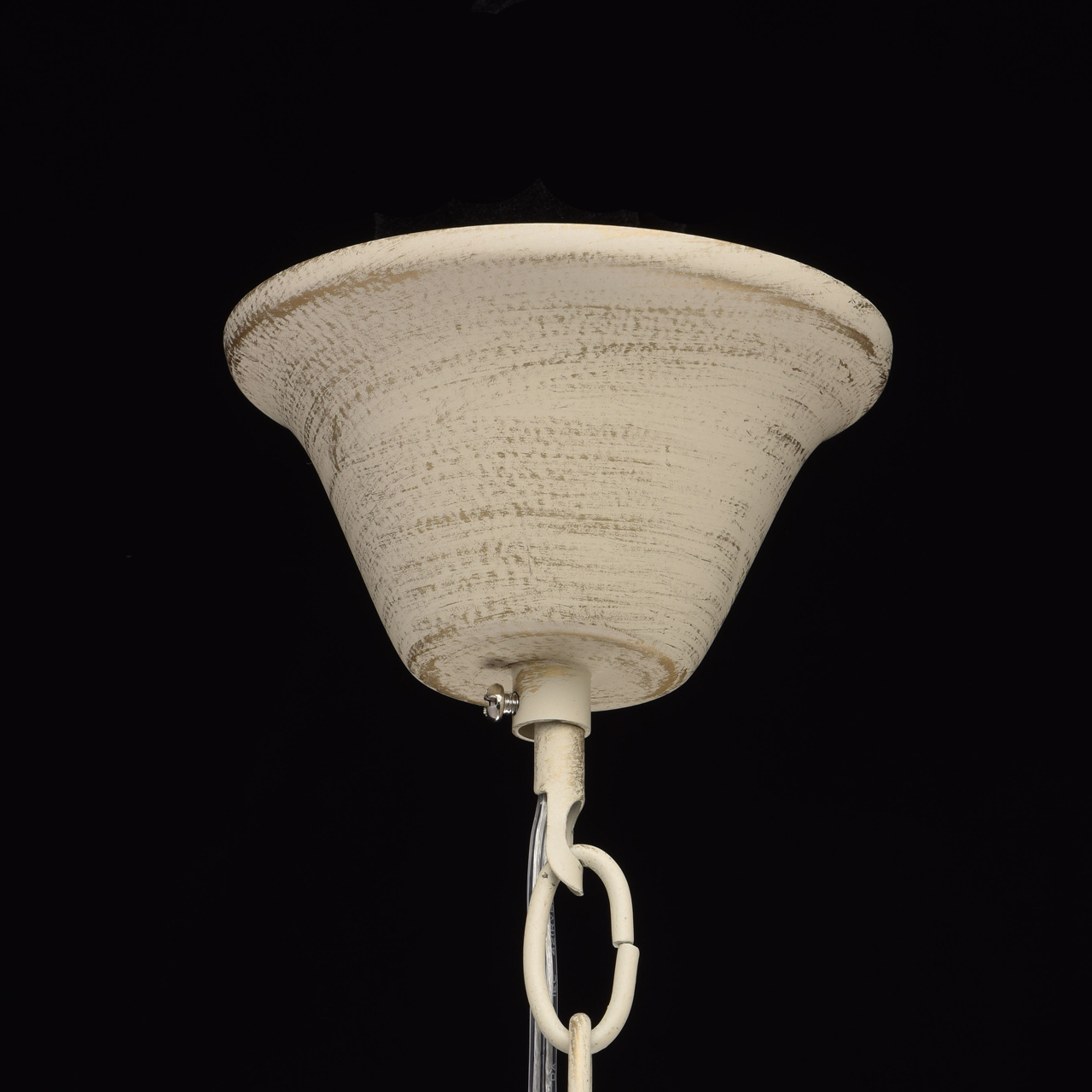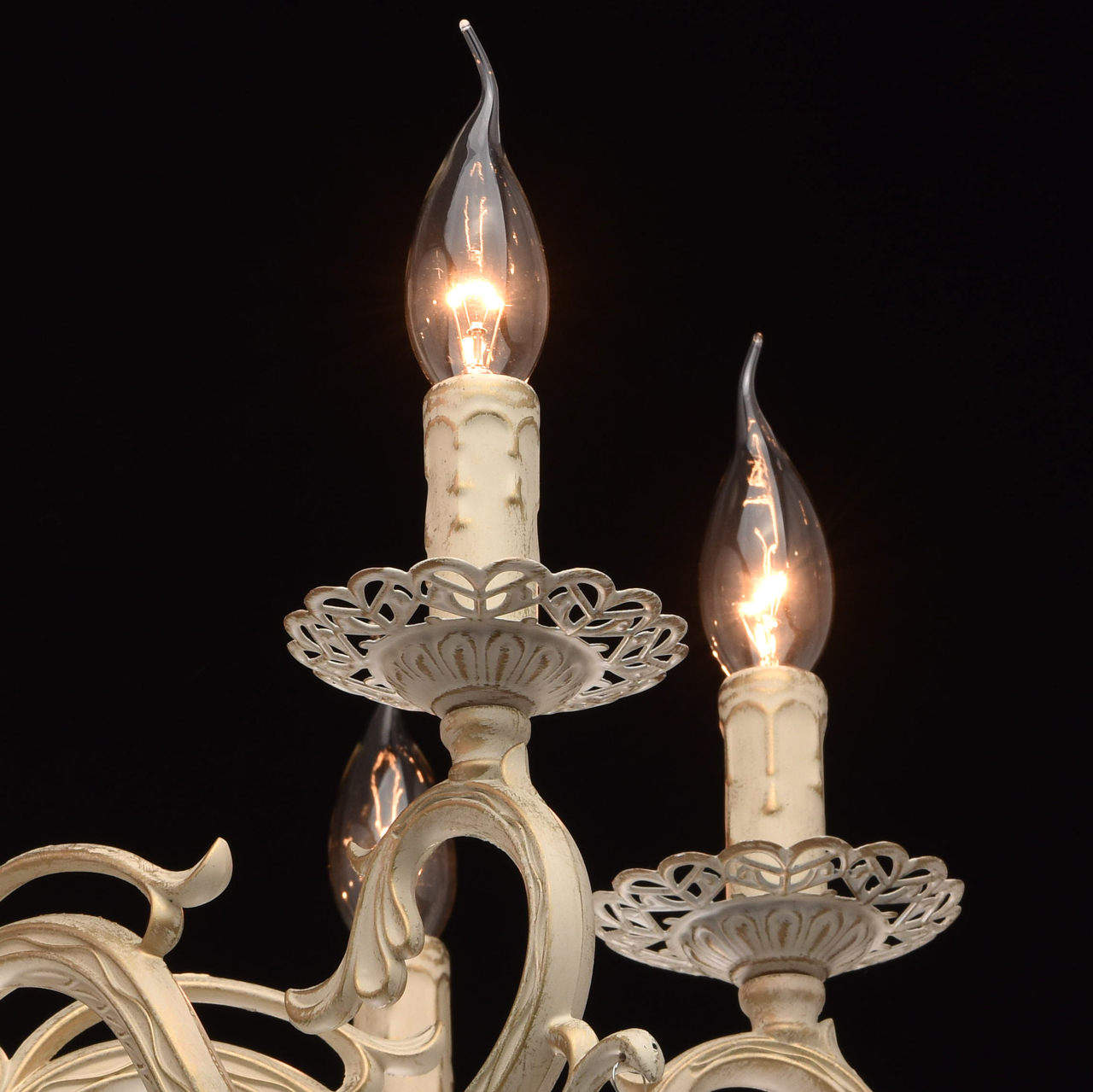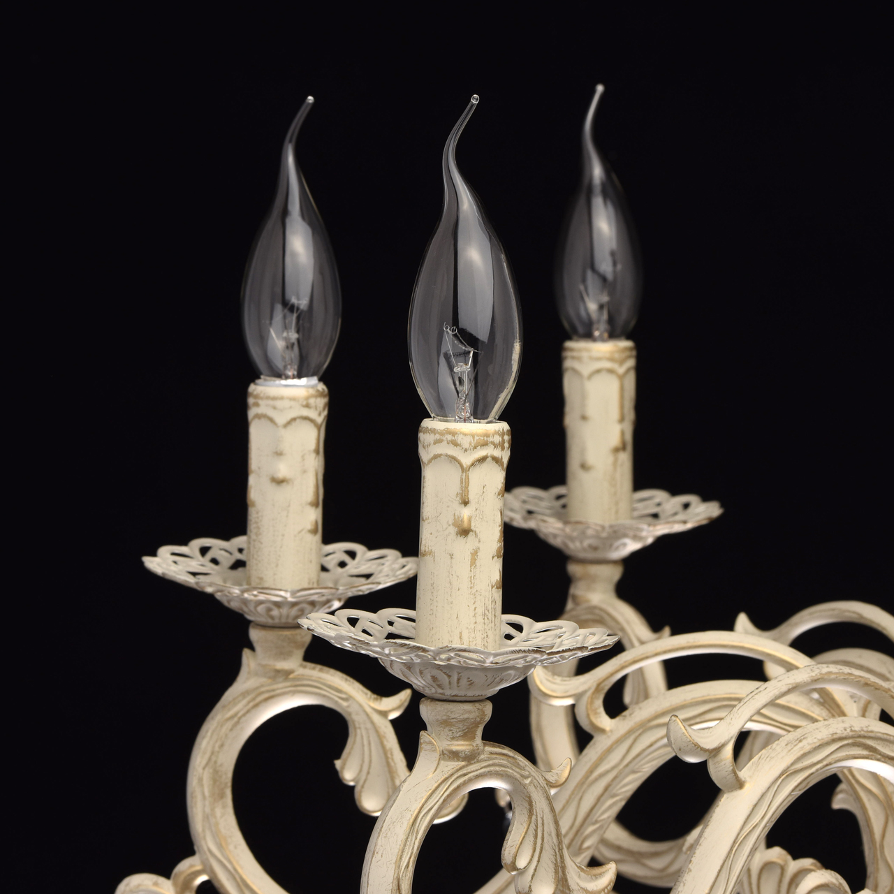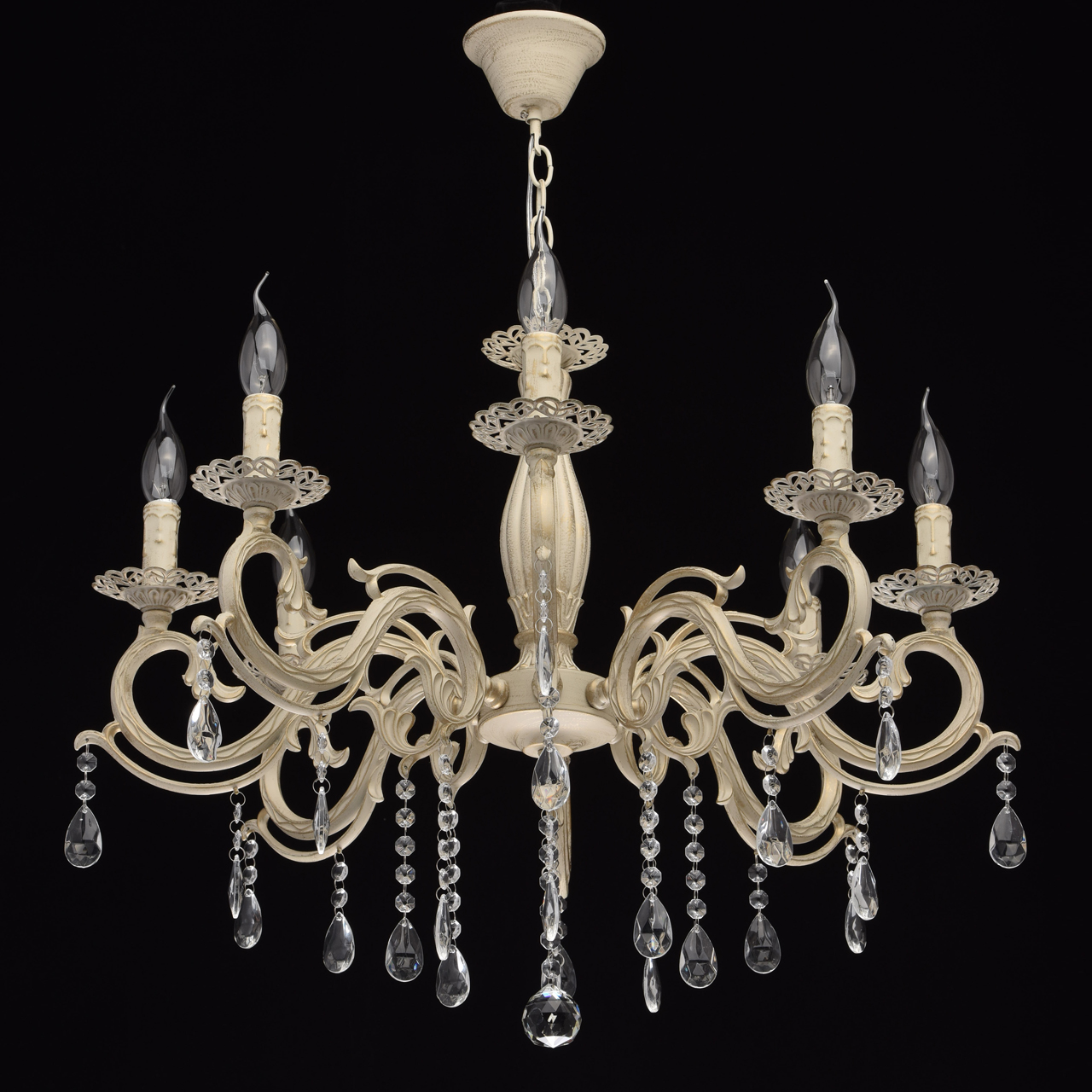 Основание из сплава металлов покрыто в технике хай-лайт: основной слой белой краски патинирован золотом. Короткий подвес 15 см в виде цепи позволяет использовать люстру в комнатах со стандартными потолками. Центральный стержень и рожки выполнены в изящных формах, украшены кружевными розетками. Плафоны отсутствуют, вместо них использованы лампы в форме свечей. Достоверное сходство с канделябром обеспечивают надпатронники с эффектом оплавленного воска. Венчают композицию россыпи из прозрачного хрусталя.