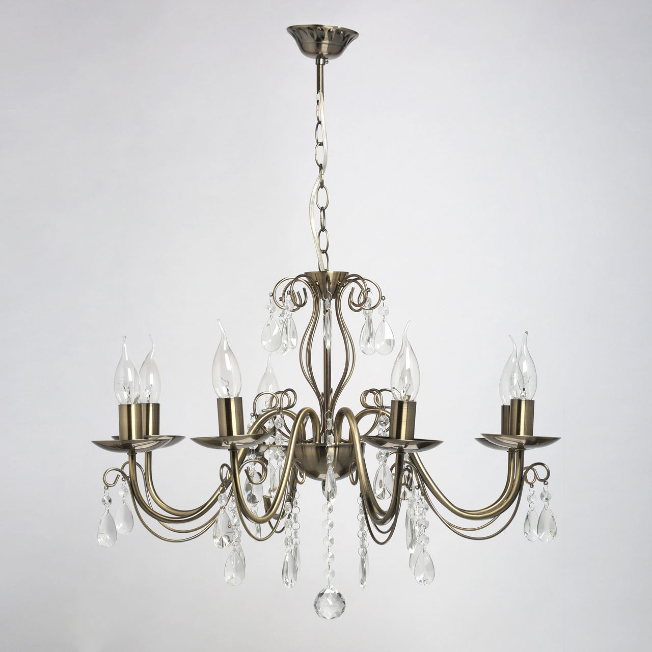 Отсутствие закрытых плафонов обеспечивает высокий уровень освещенности: потолочная лампа может быть использована в комнате площадью до 24 кв. м. Несмотря на внушительные размеры, она весит всего 2.8 кг. Оригинальный дизайн дополнят восемь ламп с цоколем E14 в форме «свеча» или «свеча на ветру», устанавливаемых по всему периметру светильника. Его высота регулируется за счет звеньев цепи.