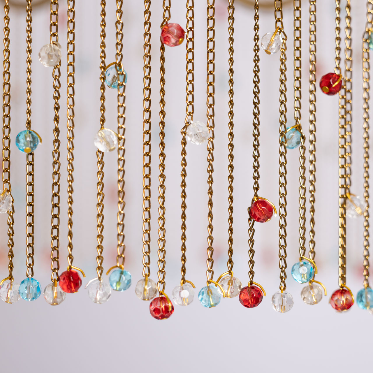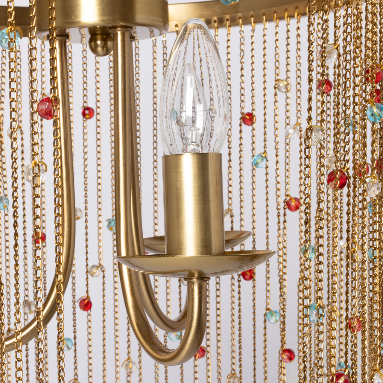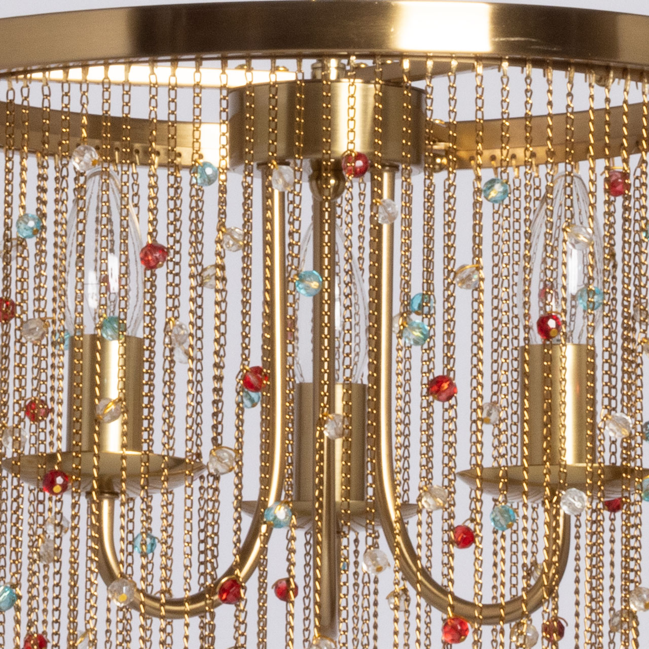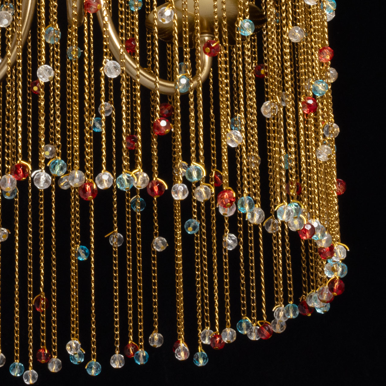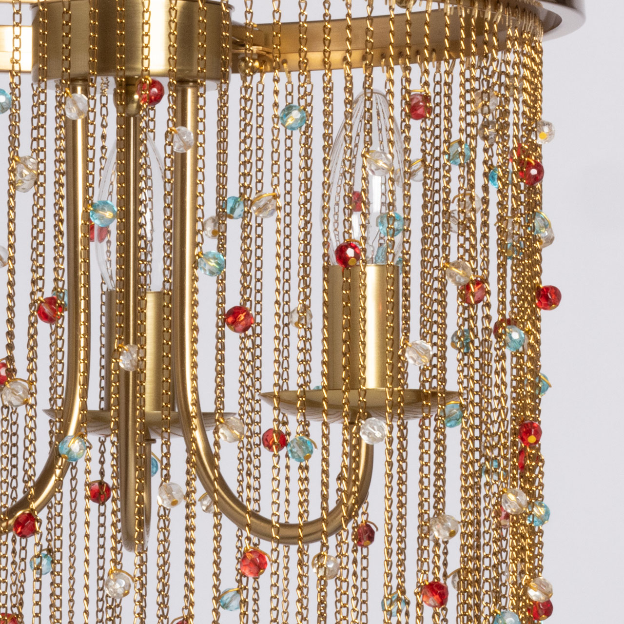 Металлическое основание подвесной люстры гальванизировано в цвет латуни. Светильник декорирован цепочками, гальванизированными в цвет основания и хрустальными бусинами, прозрачными и окрашенными в массе в голубой и красный цвета.