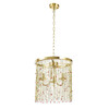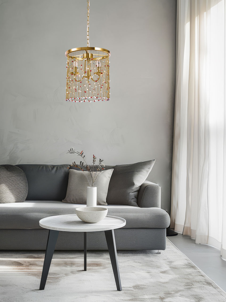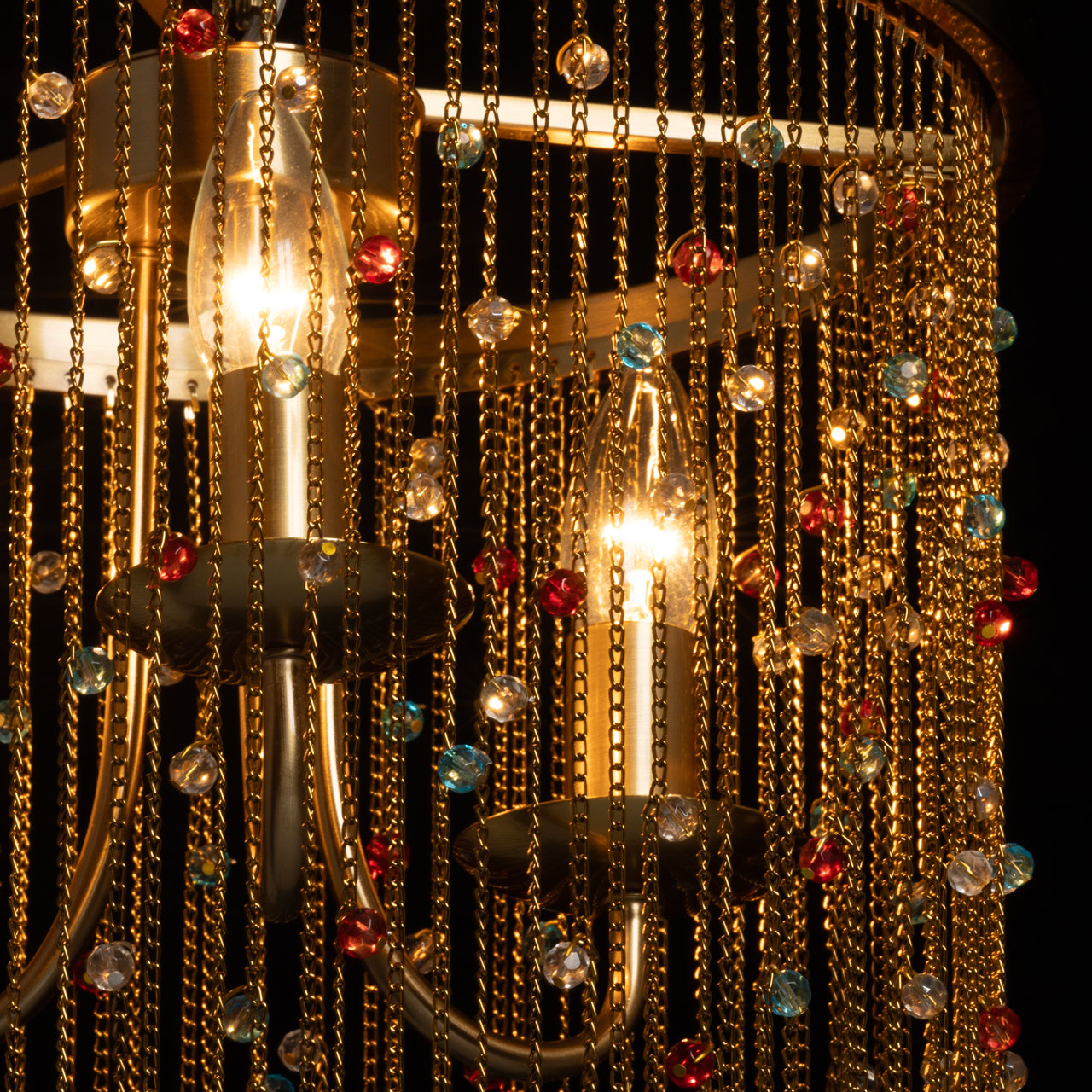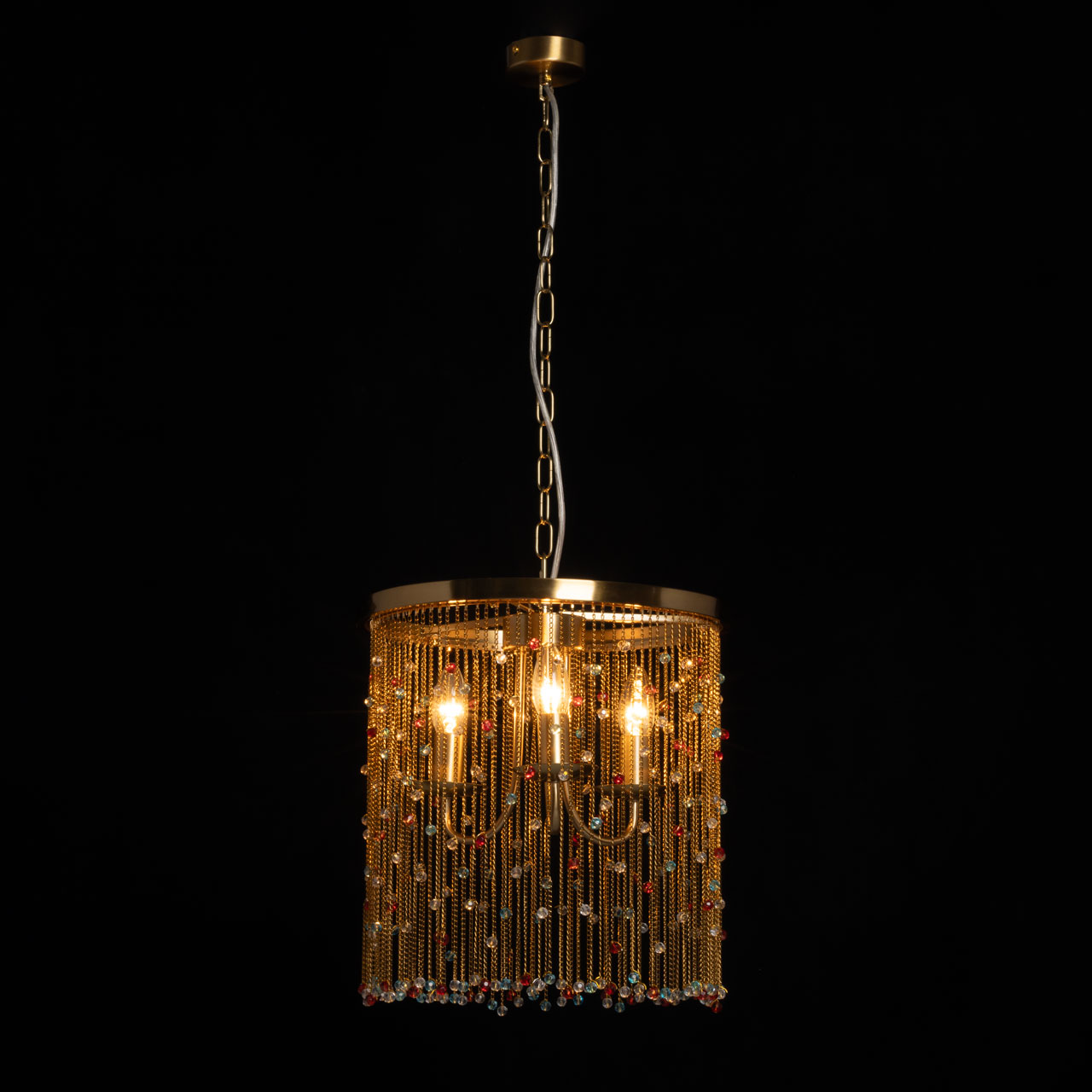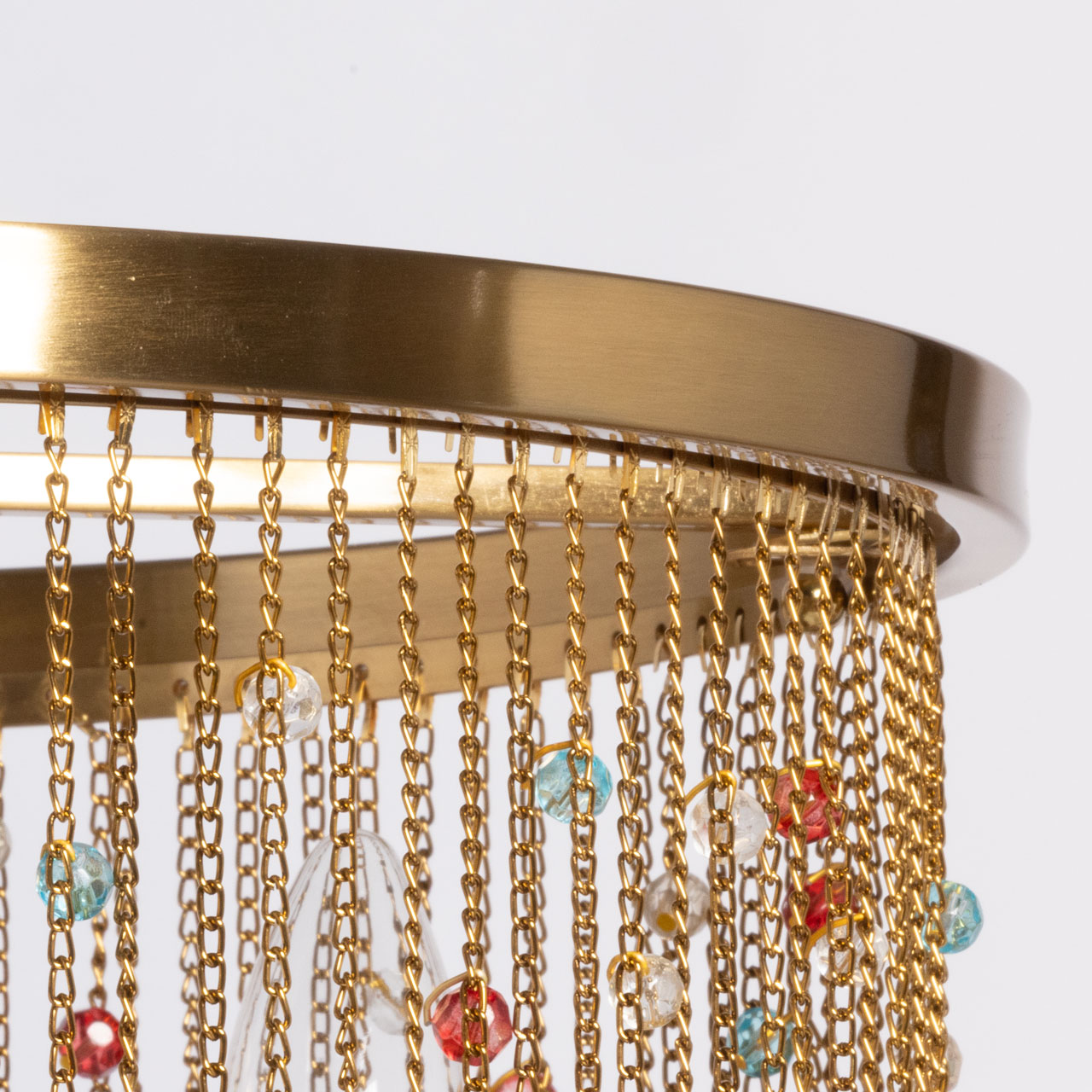 Металлическое основание подвесной люстры гальванизировано в цвет латуни. Светильник декорирован цепочками, гальванизированными в цвет основания и хрустальными бусинами, прозрачными и окрашенными в массе в голубой и красный цвета.