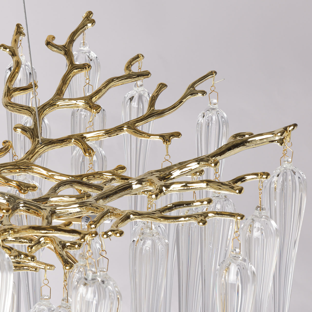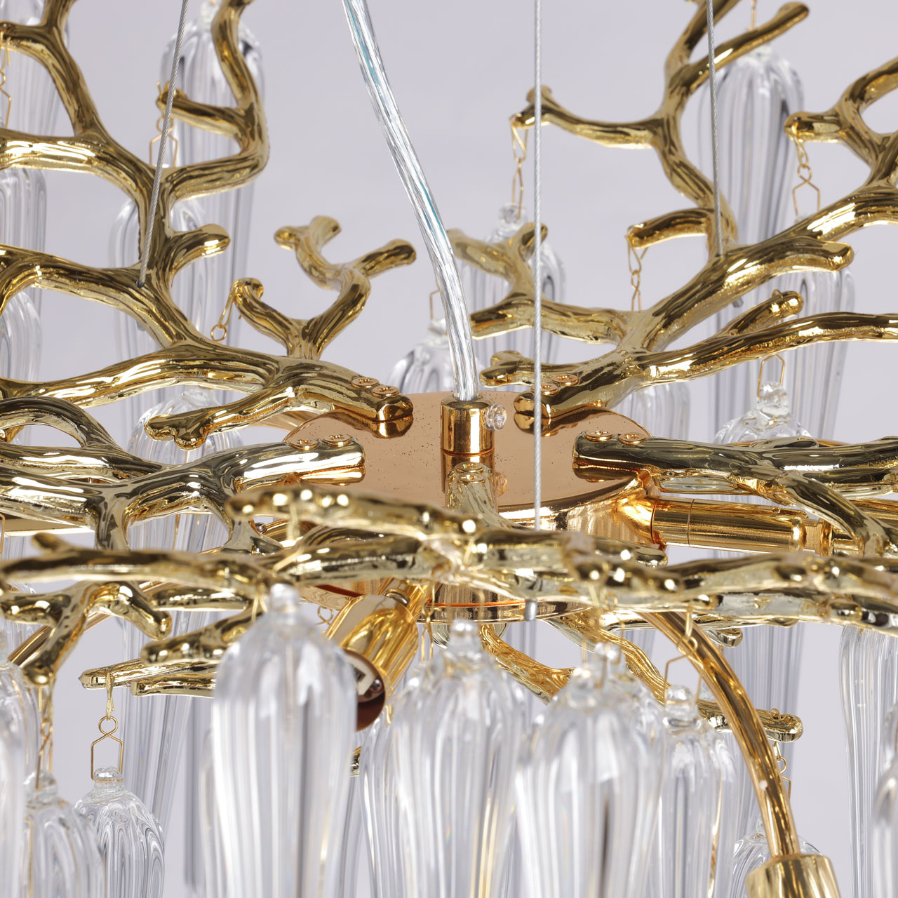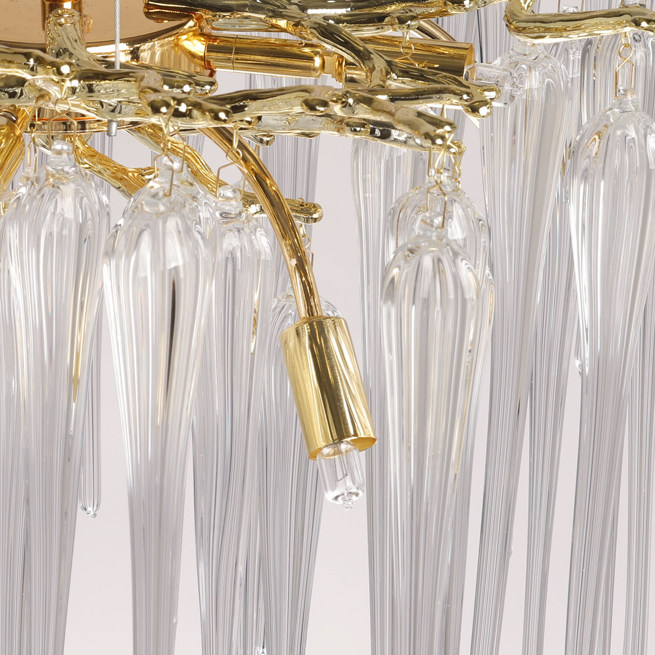 Основание подвесной люстры выполнено по технологии художественного литья из сплава алюминия с цинком и гальванизировано в цвет золота. Люстра декорирована прозрачным стеклом вытянутой формы.