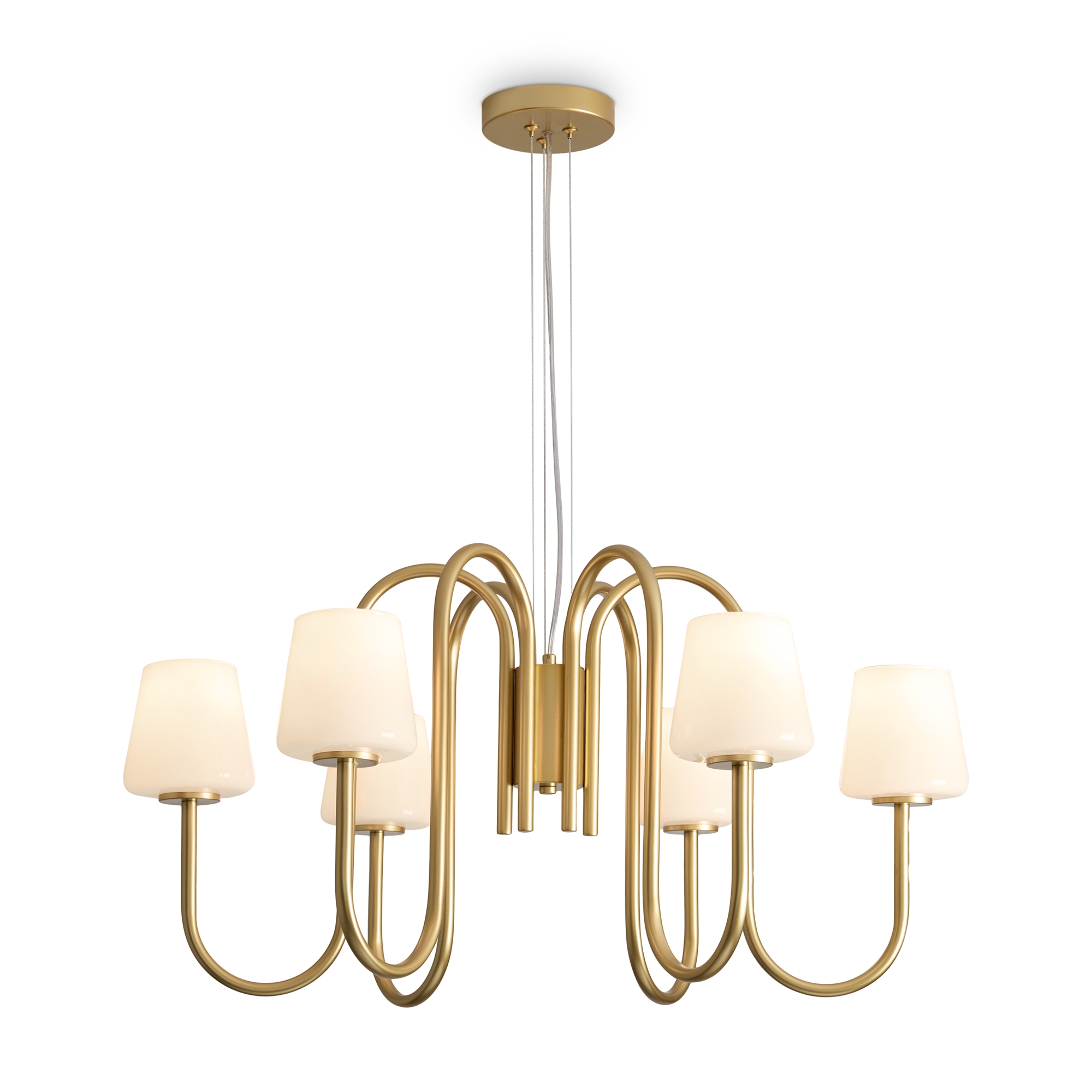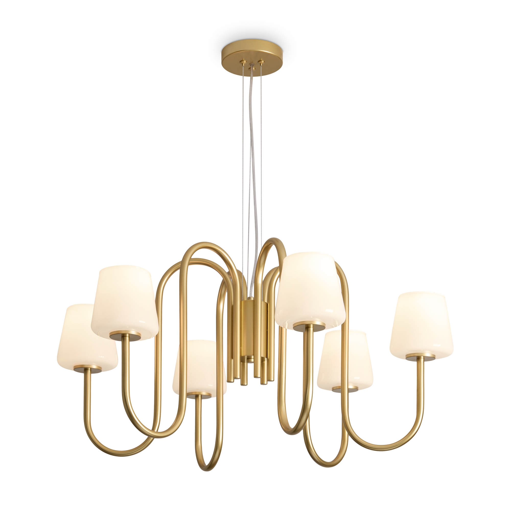 Материал арматуры — металл, цвет — матовое золото. Подвесной и настенный светильники с цоколем E14. Плафоны выполнены из белого глянцевого стекла, которые мягко рассеивают свет. Минималистичная классика подходит для современных и традиционных интерьеров. Данную модель FR2039PL-06G с быстрой доставкой спешите купить в магазине 220svet.ru