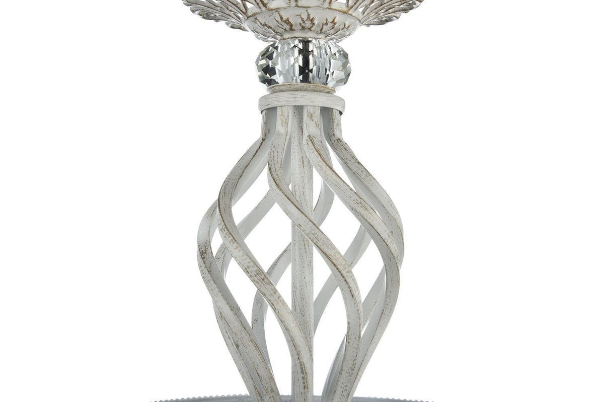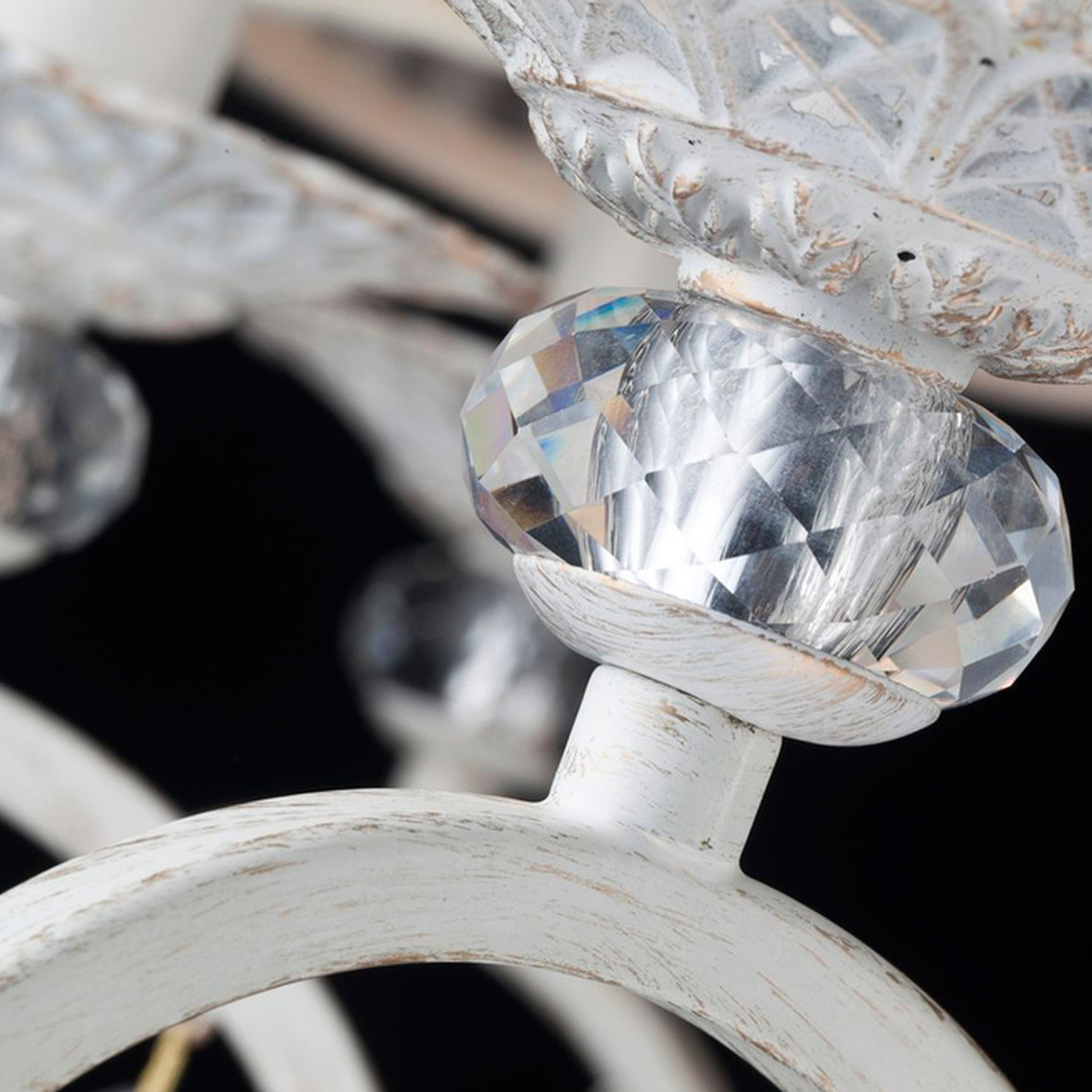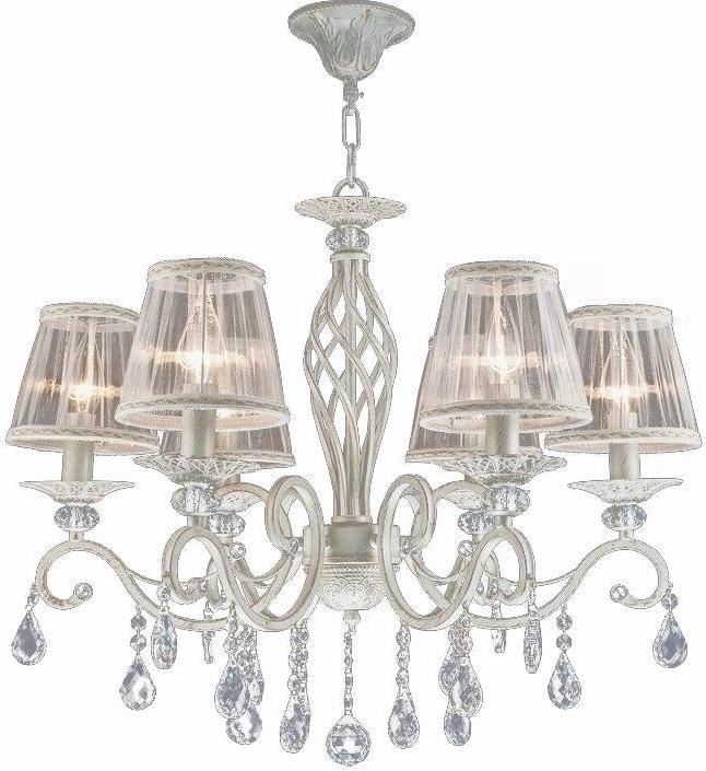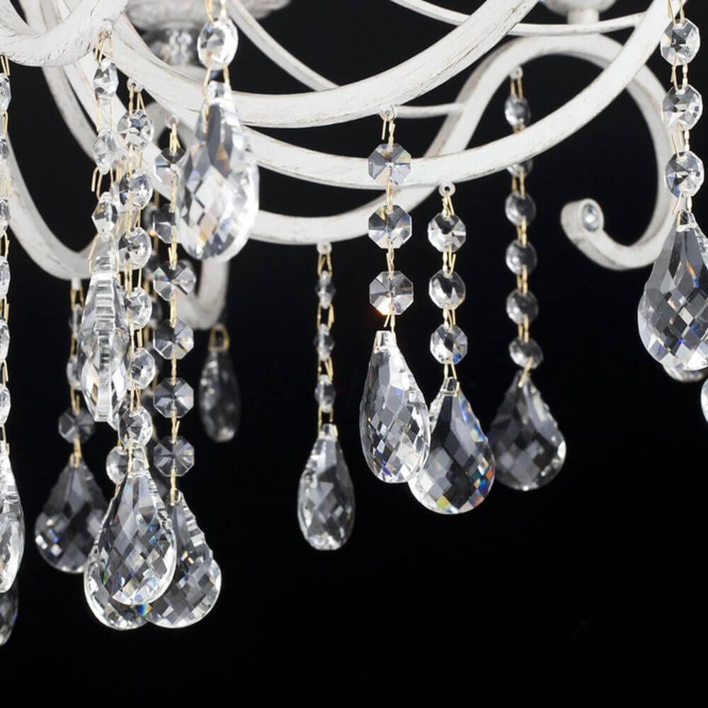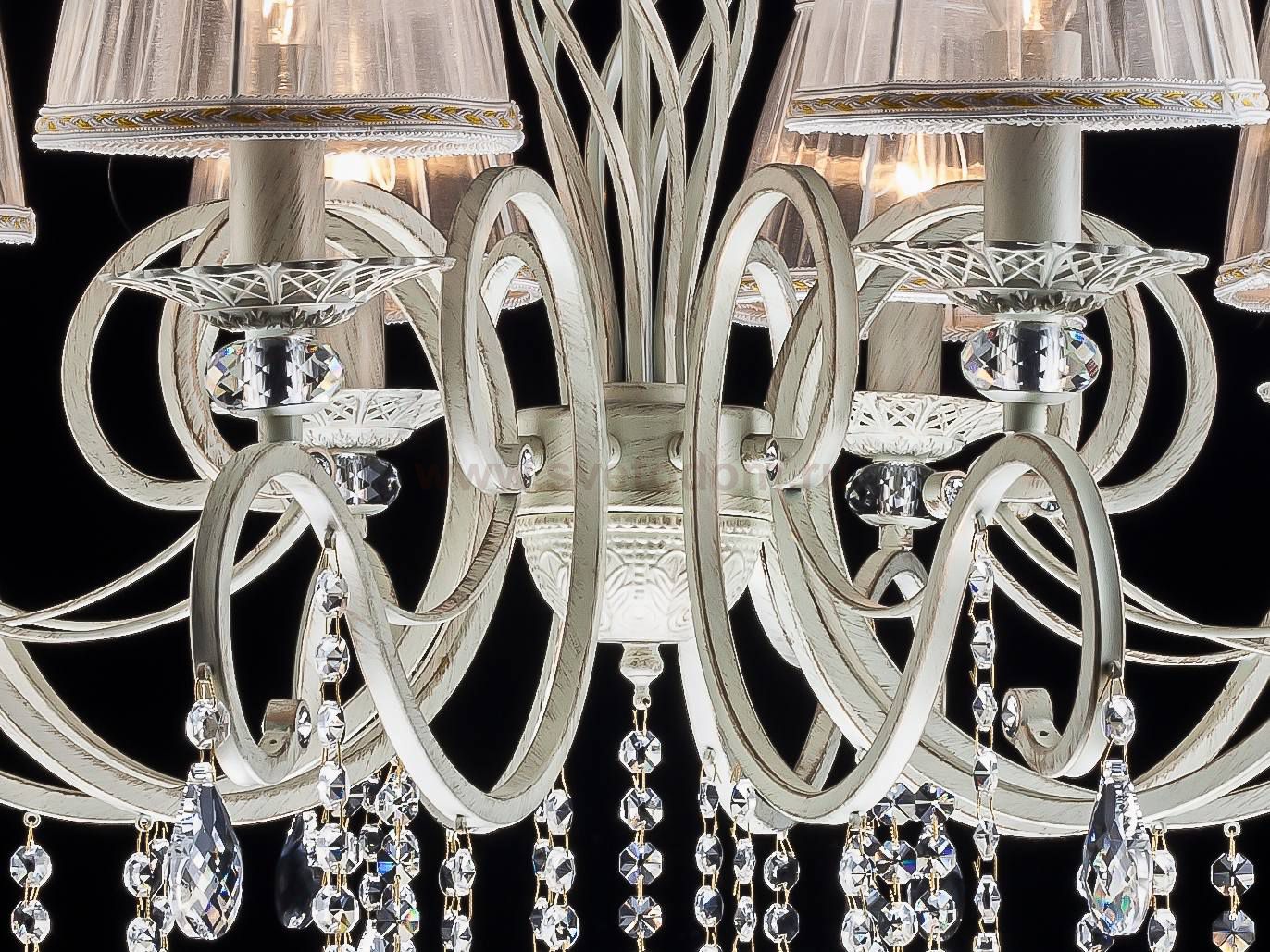 Белые текстильные абажуры из органзы и металлическая арматура белого цвета с золотом гармонично дополняют друг друга, делая эту модель люстры ещё более привлекательной. Она оснащена 6 лампами с типом цоколя Е14 и мощностью 60 Вт каждая, общая мощность составляет 360 Вт, что позволяет создать комфортное освещение на площади в 18 квадратных метров. В качестве декоративных элементов используются витиеватые сплетения металла в основании светильников и подвесы из кристаллов, подчеркивающие роскошь и стиль. Тип подвеса - цепь, длина которой составляет 530 мм. Технической особенностью является регулировка по высоте.