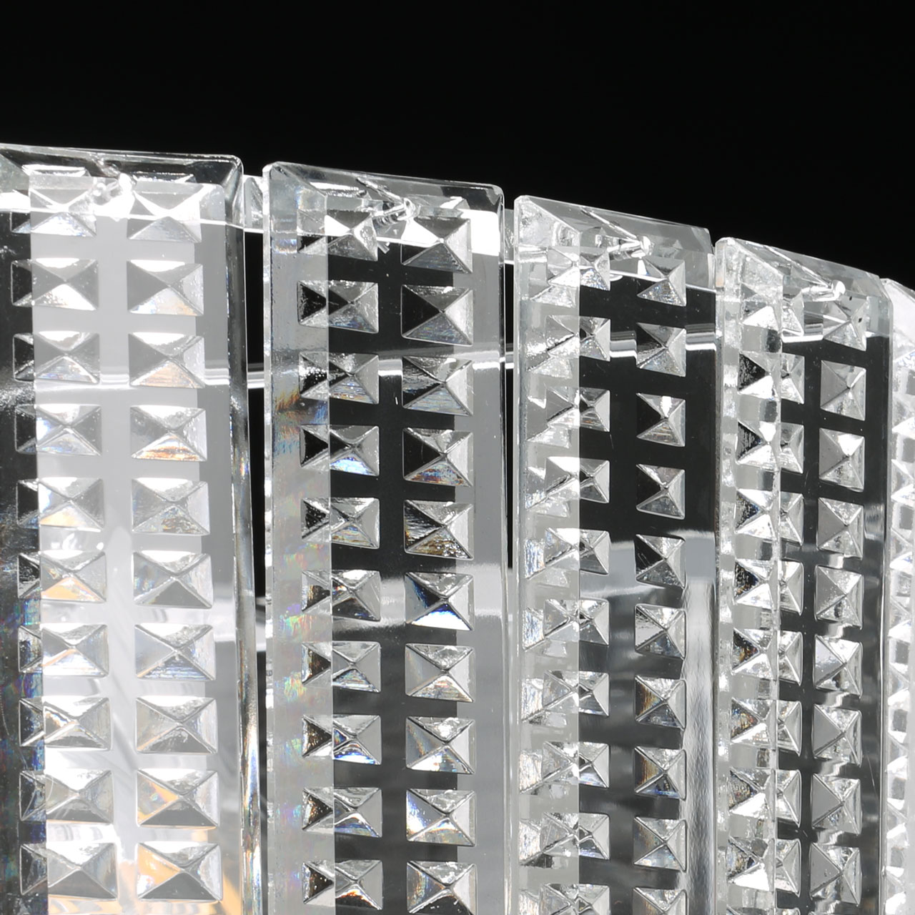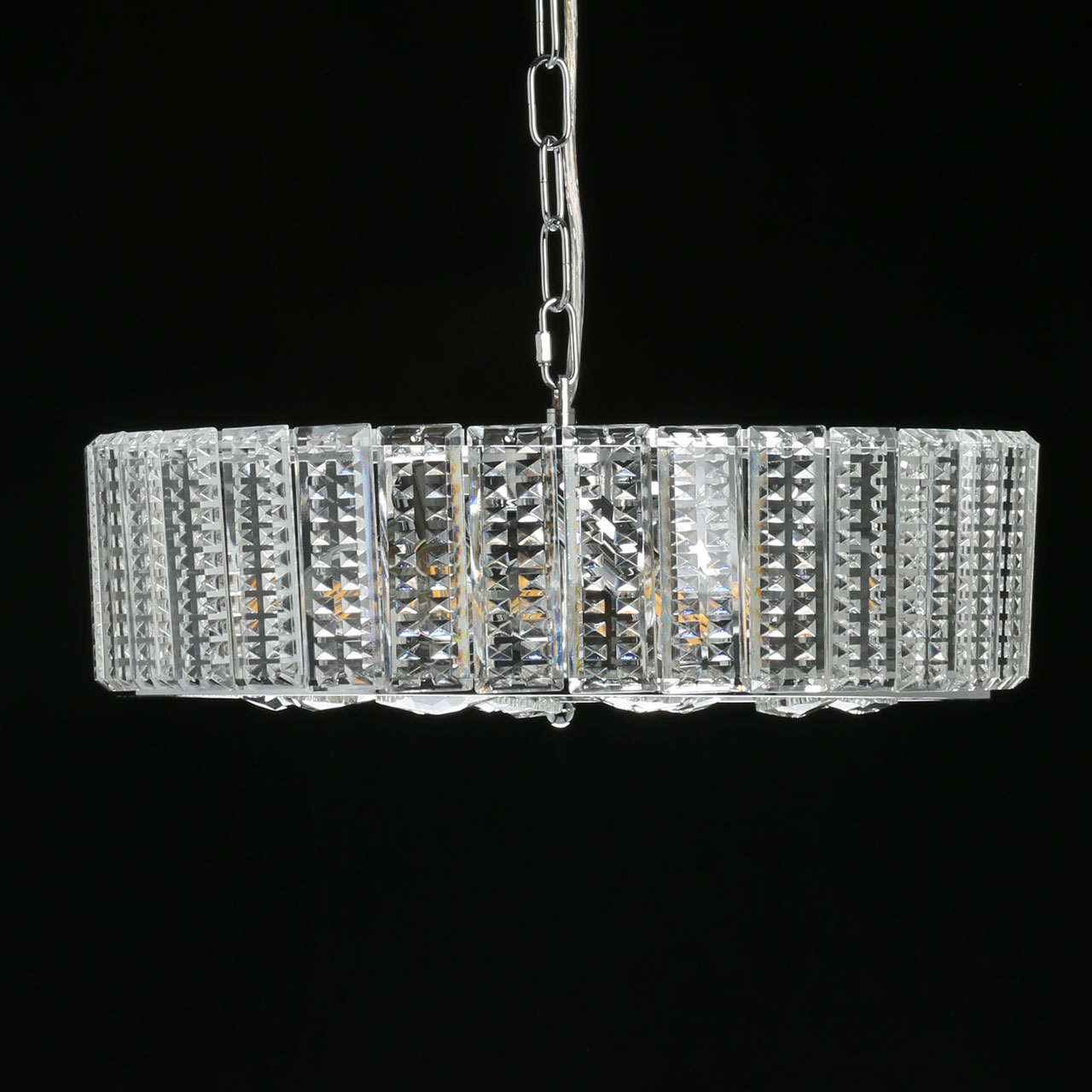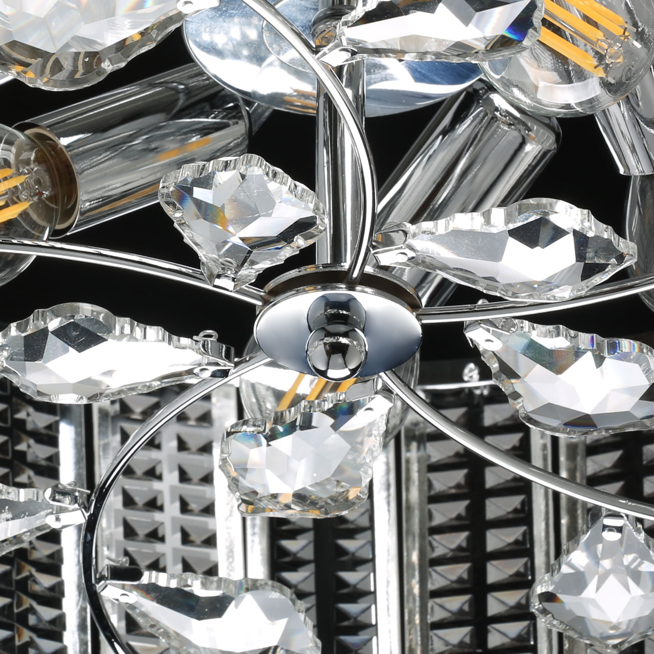 Хромированное металлическое основание служит каркасом для крепления декоративных хрустальных элементов. Оно же придает потолочной люстре современный вид, что позволяет без труда вписать светильник в любой интерьер. Глянцевое покрытие дополнительно рассеивает свет, делая блеск более ярким.