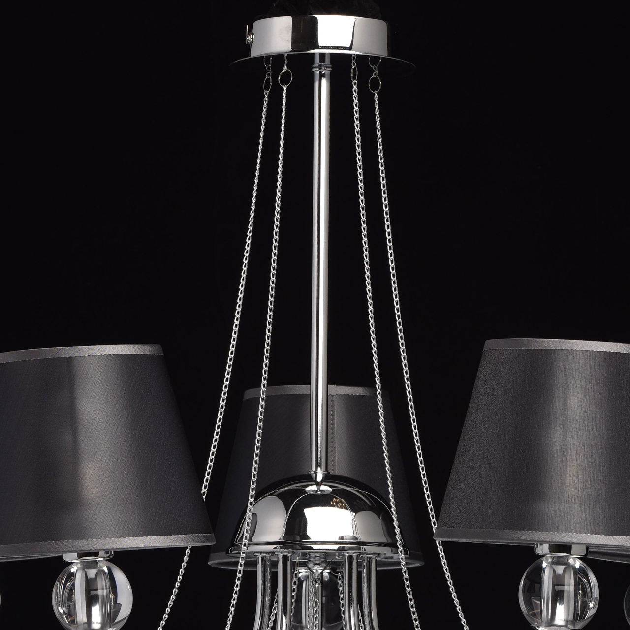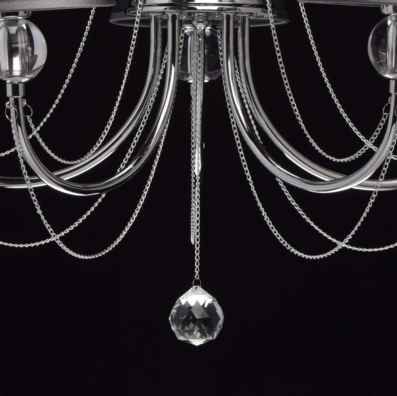богатый декор, включающий композицию из тонких серебристых цепочек, хрустальную подвеску с кристаллом фантазийной огранки и стеклянные шары на рожках люстры;