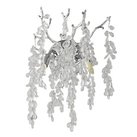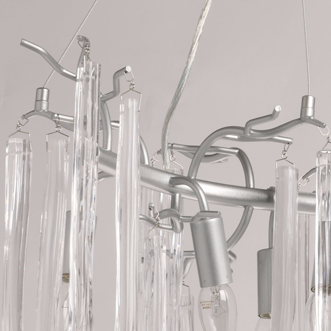 Металлическое основание подвесной люстры окрашено в цвет перламутрового серебра. Люстра декорирована прозрачными стеклянными подвесками и подвесками, окрашенными в белый цвет.