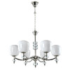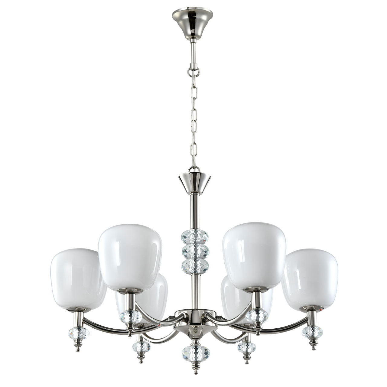 Металлическое основание светильника гальванизировано в цвет хрома. Стеклянные плафоны вытянутой формы окрашены в белый цвет изнутри. Люстра декорирована прозрачными массивами хрусталя. Актуальный дизайн потолочной люстры подойдет для гостиной, спальни и кухни.