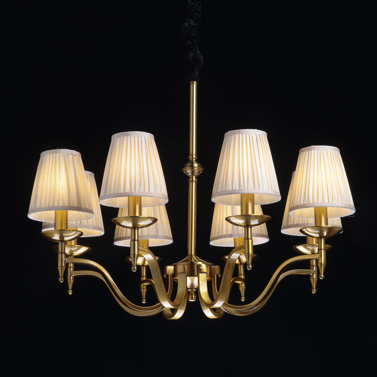 Классический дизайн сохраняет свою актуальностьЦвет медовая бронза придает люстре утонченную привлекательностьТекстильные абажуры создают мягкое комфортное освещениеЗаменяемые источники света удобны в эксплуатацииВозможность регулировать комфортную высоту