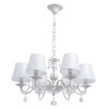 Основание из металлического сплава окрашено в белый матовый тон с эффектом золотой патины, которая создает иллюзию благородной состаренности. От основания спускается подвес в виде цепи длиной 28 см. Декоративная розетка и изящно изогнутые рожки увенчаны тканевыми плафонами с сатиновой текстурой. Особенность модели – в резных элементах и хрустальных каплях, которые украшают люстру и создают световые переливы.