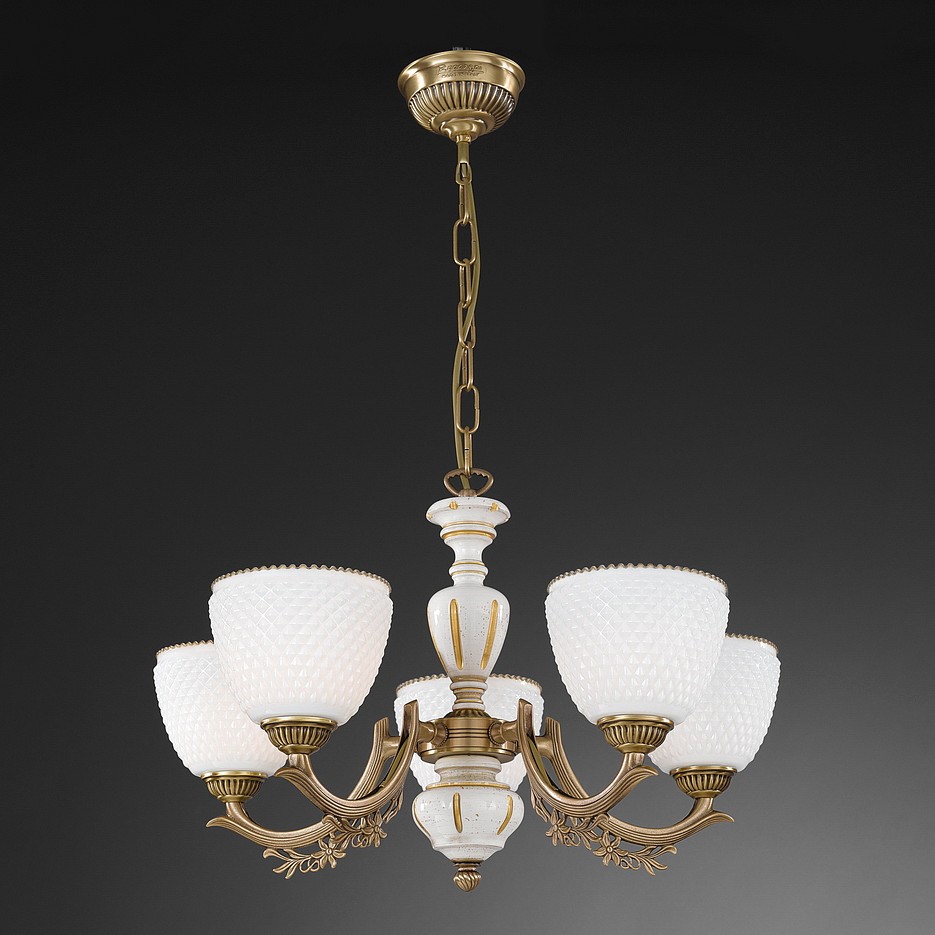 Подвесная люстра Reccagni Angelo L 8656/5 Итальянского производсва – отличный выбор для Вас. Этот светильник Классического стиля хорошо подойдет Для гостиной и придаст помещению мягкий и приятный свет. Плафоны белые из стекла. Арматура бронза из металла. Кол-во ламп - 5шт. Общая мощность 300W