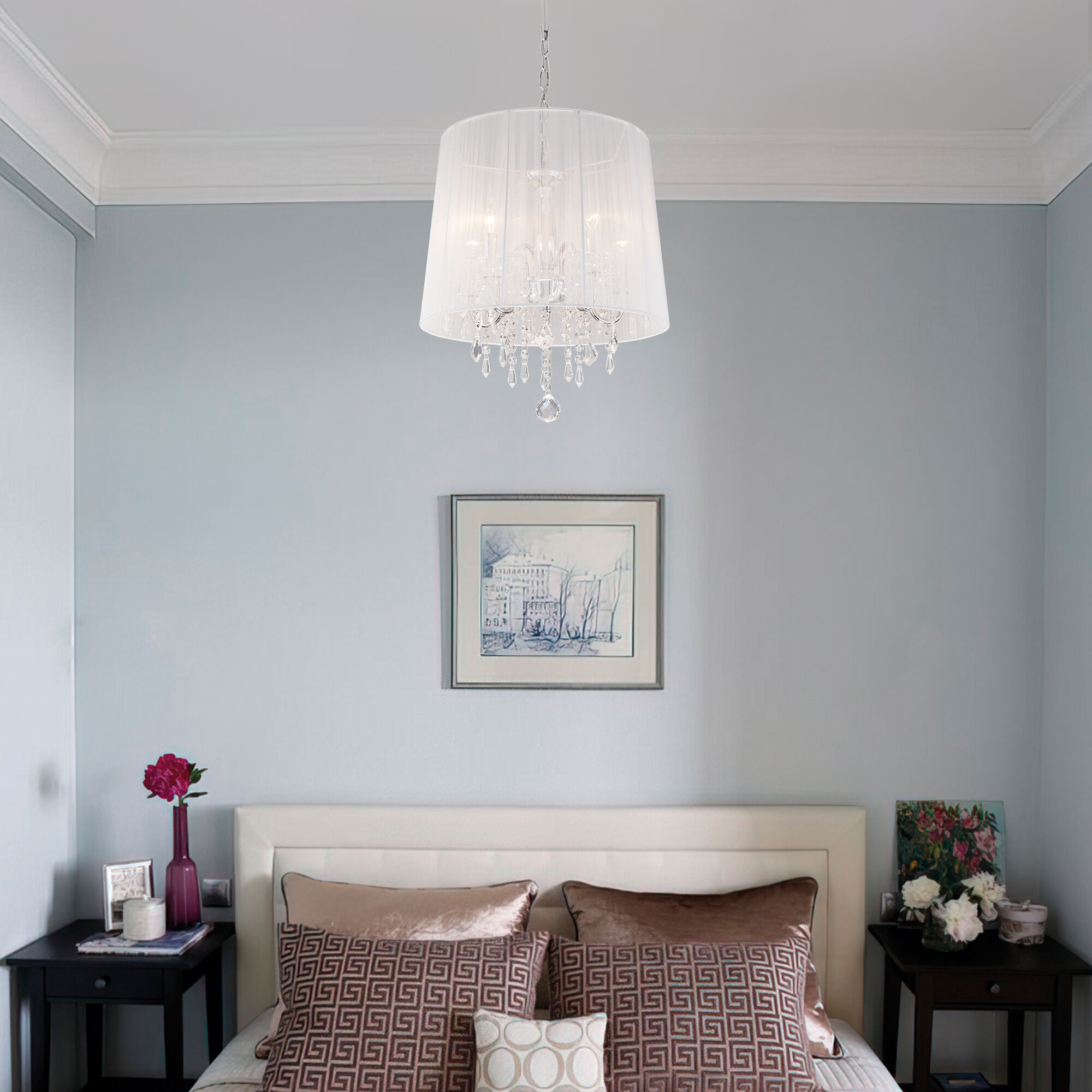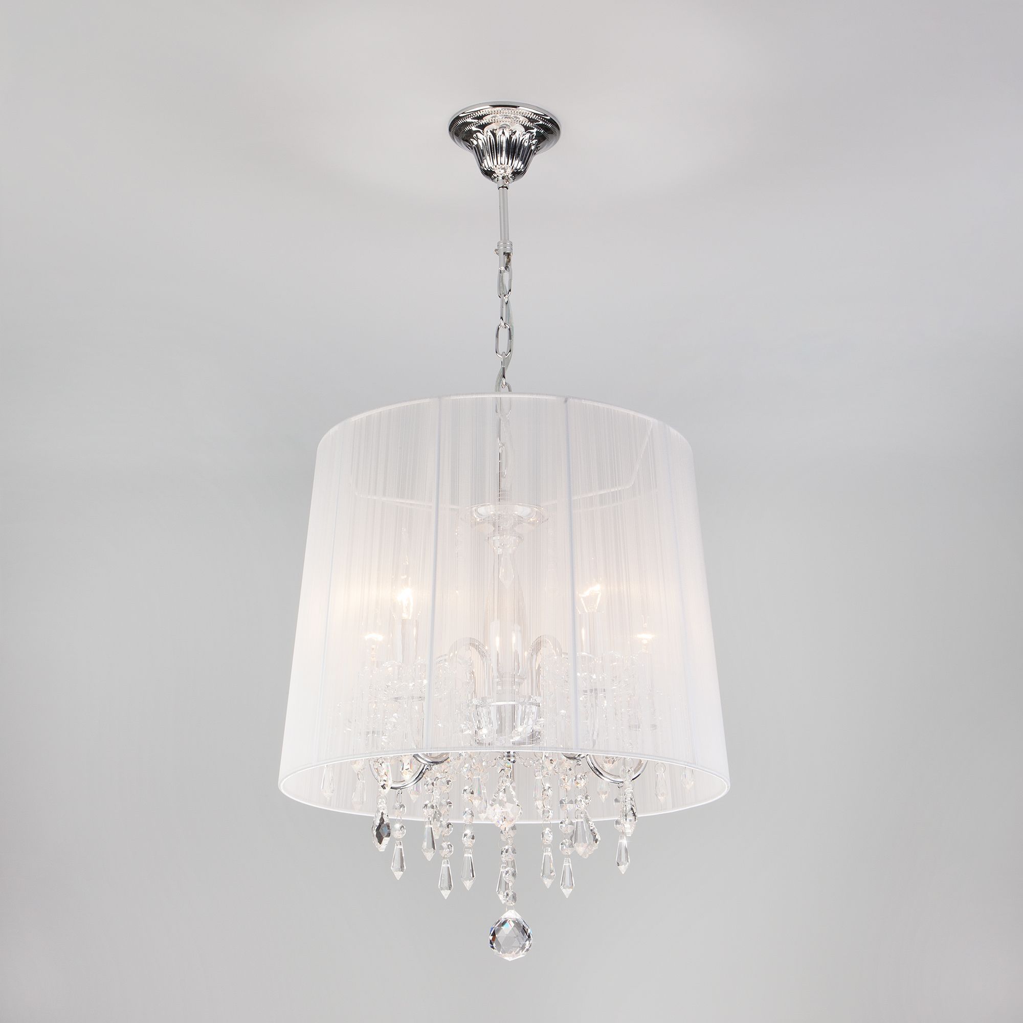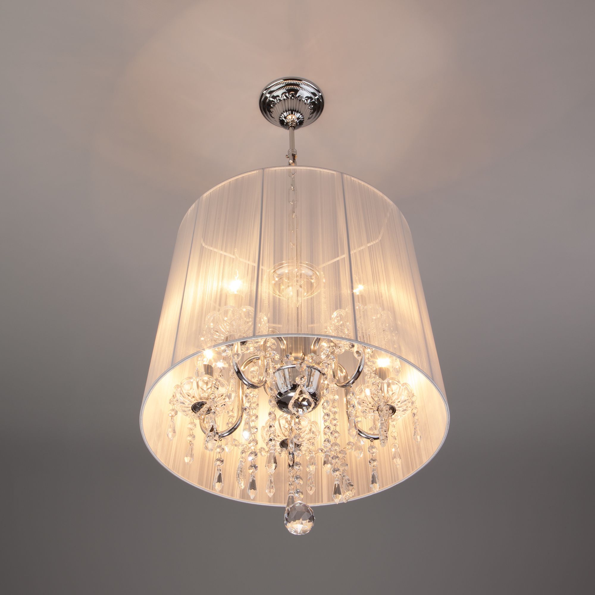 Люстра потолочная с абажуром и хрусталем 2045/5 хром/белый предназначена для создания основного освещения в современных и классических интерьерах, подходит для различных типов помещений: гостиная, спальня и рассчитана на площадь освещения 16м².