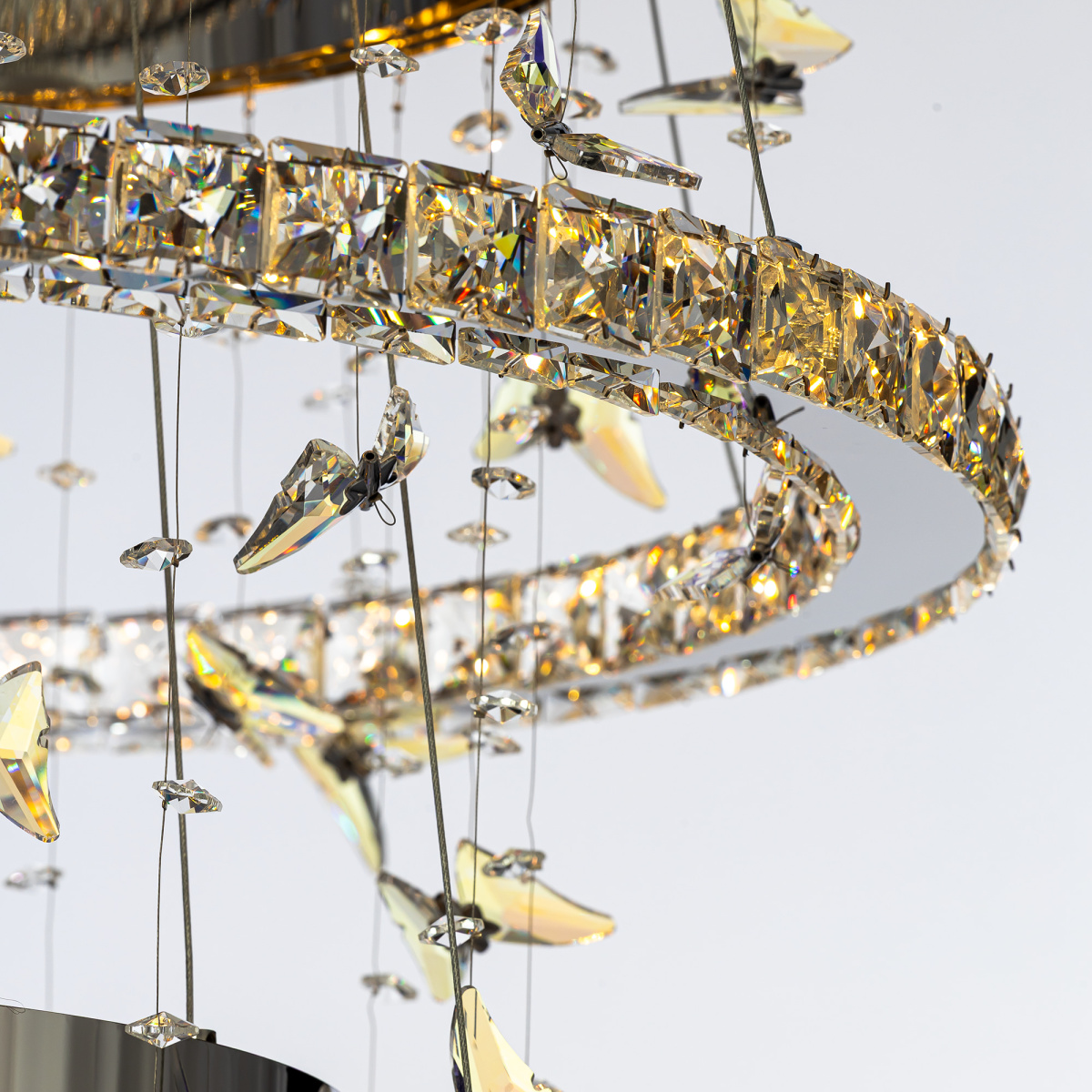 Светодиодная каскадная люстра Citilux ETERA CL322090 словно хрустальный водопад света, ниспадающий с потолка, превращает пространство в волшебный дворец из переливающихся бликов. Восемь подвесных колец из хромированного металла и огранённого хрусталя рассыпают по стенам искристые блики, а изящные подвески в форме бабочек отливают глубокой синевой.