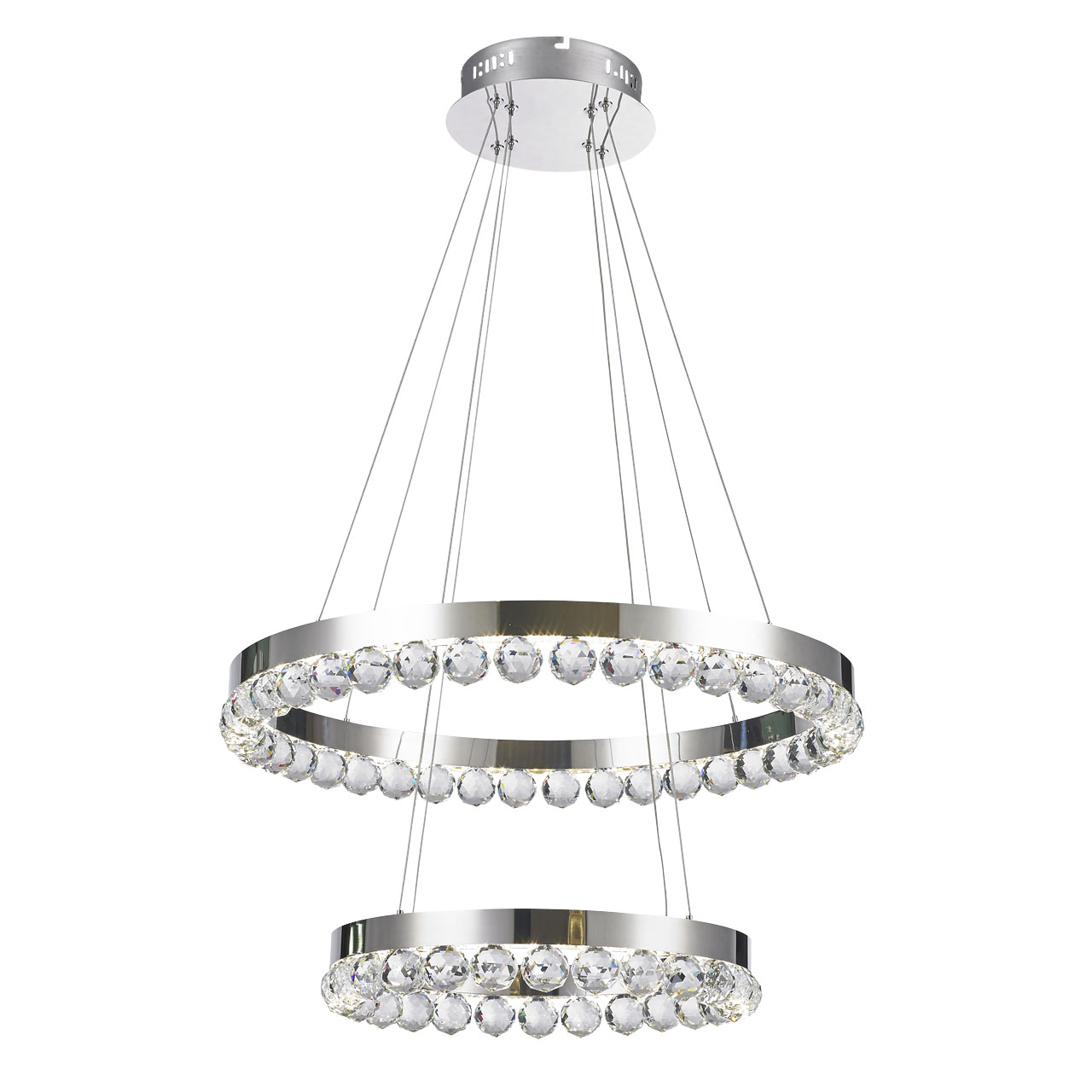 Металлическая потолочная чаша гальванизирована в цвет хрома. Корпус плафонов выполнен из нержавеющей стали, отполированной до зеркального блеска. Подвесная люстра декорирована прозрачным хрусталем в форме шаров. Высокотехнологичный подвесной светильник большой мощности.