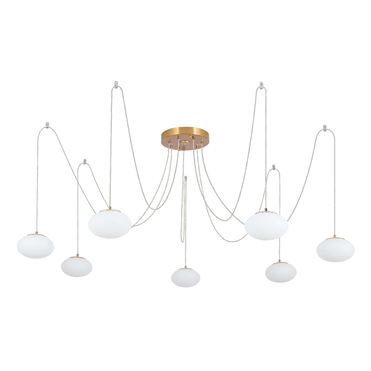 Оригинальная люстра с круглым бронзовым основанием и длинными проводами по 1,55м. Каждый провод можно закрепить на потолке в произвольном порядке, создавая уникальный дизайн светильника. Модель легко адаптировать для высоких, стандартных и низких потолков. Плафоны в форме сфероида изготовлены из матового оптического полимера. В каждом из 7 плафонов находится уникальный светодиодный модуль, обеспечивающий яркое основное освещение или красочную RGB-подсветку с плавной регулировкой яркости во всех режимах света.