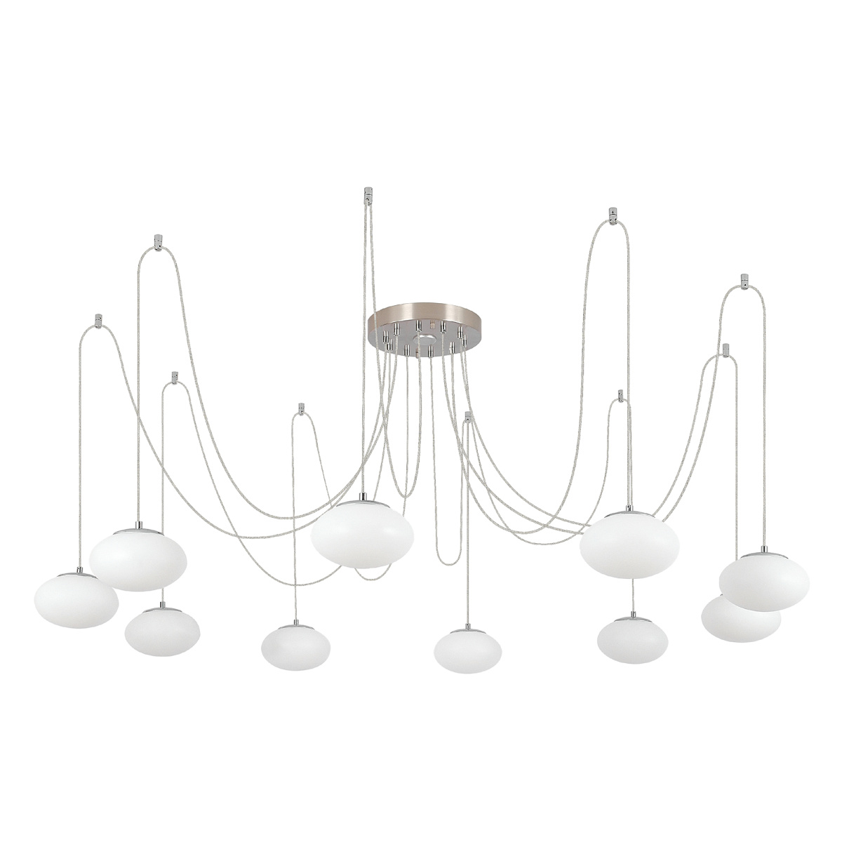 Оригинальная люстра с круглым матовым хромированным основанием и длинными проводами (по 1,55м). Каждый провод можно закрепить на потолке в произвольном порядке, создавая уникальный дизайн светильника. Модель легко адаптировать для высоких, стандартных и низких потолков. Плафоны в форме сфероида изготовлены из матового оптического полимера. В каждом из 10 плафонов находится уникальный светодиодный модуль, обеспечивающий яркое основное освещение или красочную RGB-подсветку с плавной регулировкой яркости во всех режимах света.