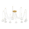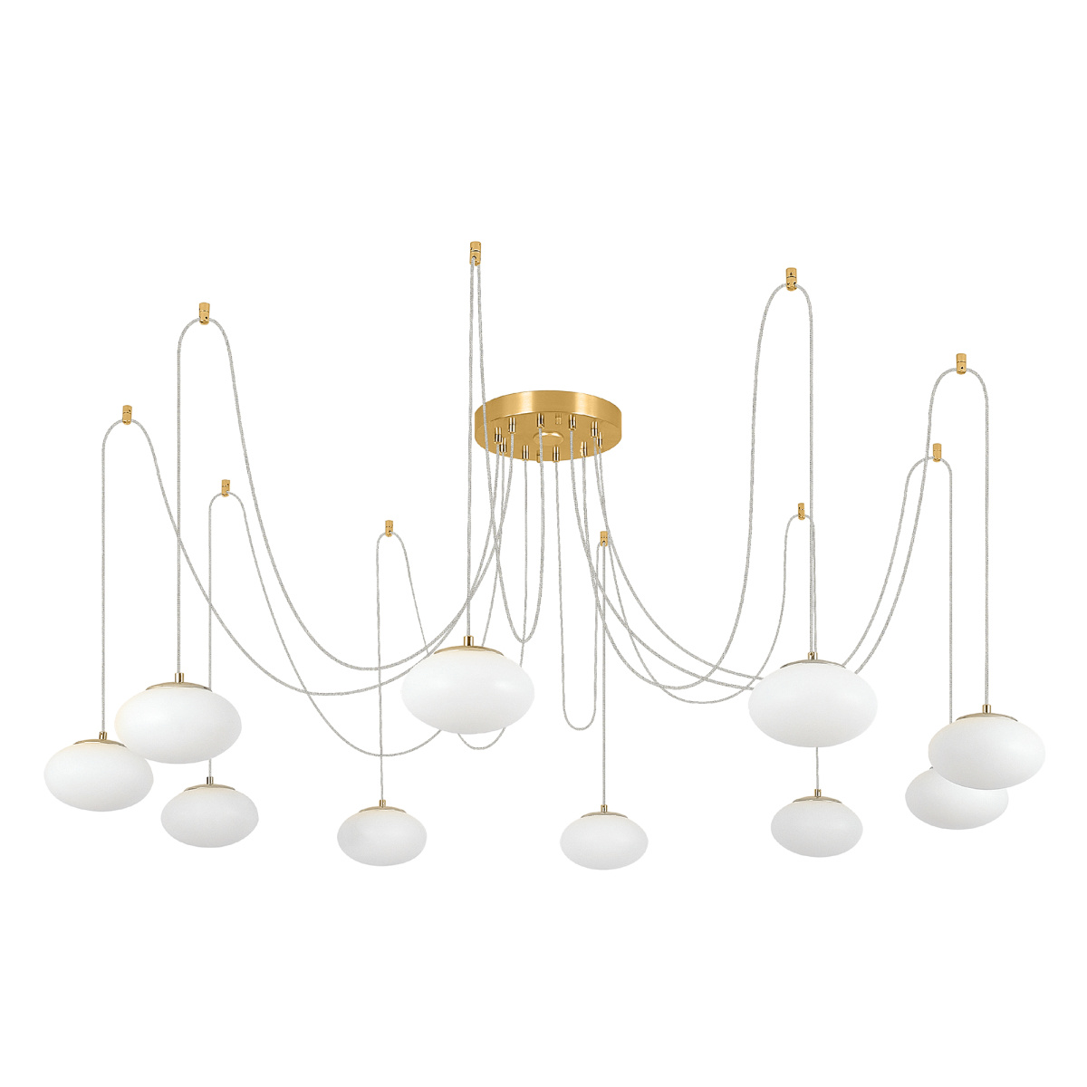 Оригинальная люстра с круглым бронзовым основанием и длинными проводами по 1,55м. Каждый провод можно закрепить на потолке в произвольном порядке, создавая уникальный дизайн светильника. Модель легко адаптировать для высоких, стандартных и низких потолков. Плафоны в форме сфероида изготовлены из матового оптического полимера. В каждом из 10 плафонов находится уникальный светодиодный модуль, обеспечивающий яркое основное освещение или красочную RGB-подсветку с плавной регулировкой яркости во всех режимах света.