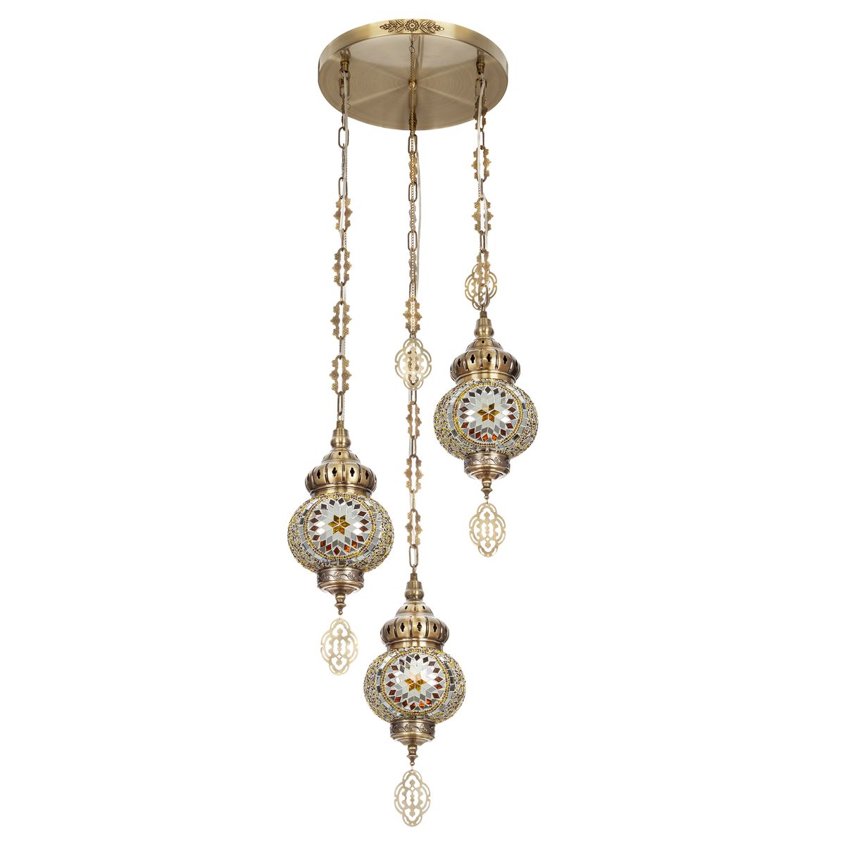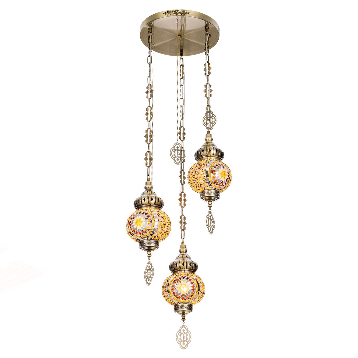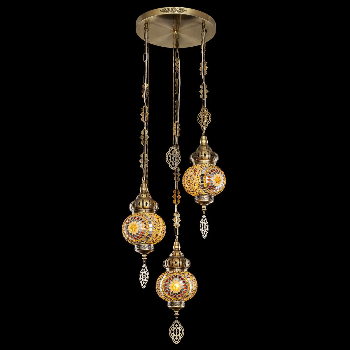 Три подвесных плафона выполненных в форме слегка приплюснутых шаров, словно капли меда, застывшие в воздухе. Стеклянная мозаика в оттенках янтаря наполняет пространство теплым, уютным свечением. Металлический каркас благородного бронзового цвета украшен искусной чеканкой.