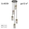 Каркас светильника — металлический, основание круглое, черного оттенка, на нем закреплено пять подвесов. Бронзовые плафоны — цилиндрической формы, с хрустальными подвесками. Высоту подвесов можно отрегулировать, подстраиваясь под высоту потолков в помещении. Для изделия используются пять лампочек с цоколем Е14, максимальная мощность для ламп накаливания — 40Вт.