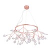 Подвесной светильник с розово-медной арматурой и лампами в виде листьев на ветках, ниспадающих от металлического кольца, подвешенного на тросах.