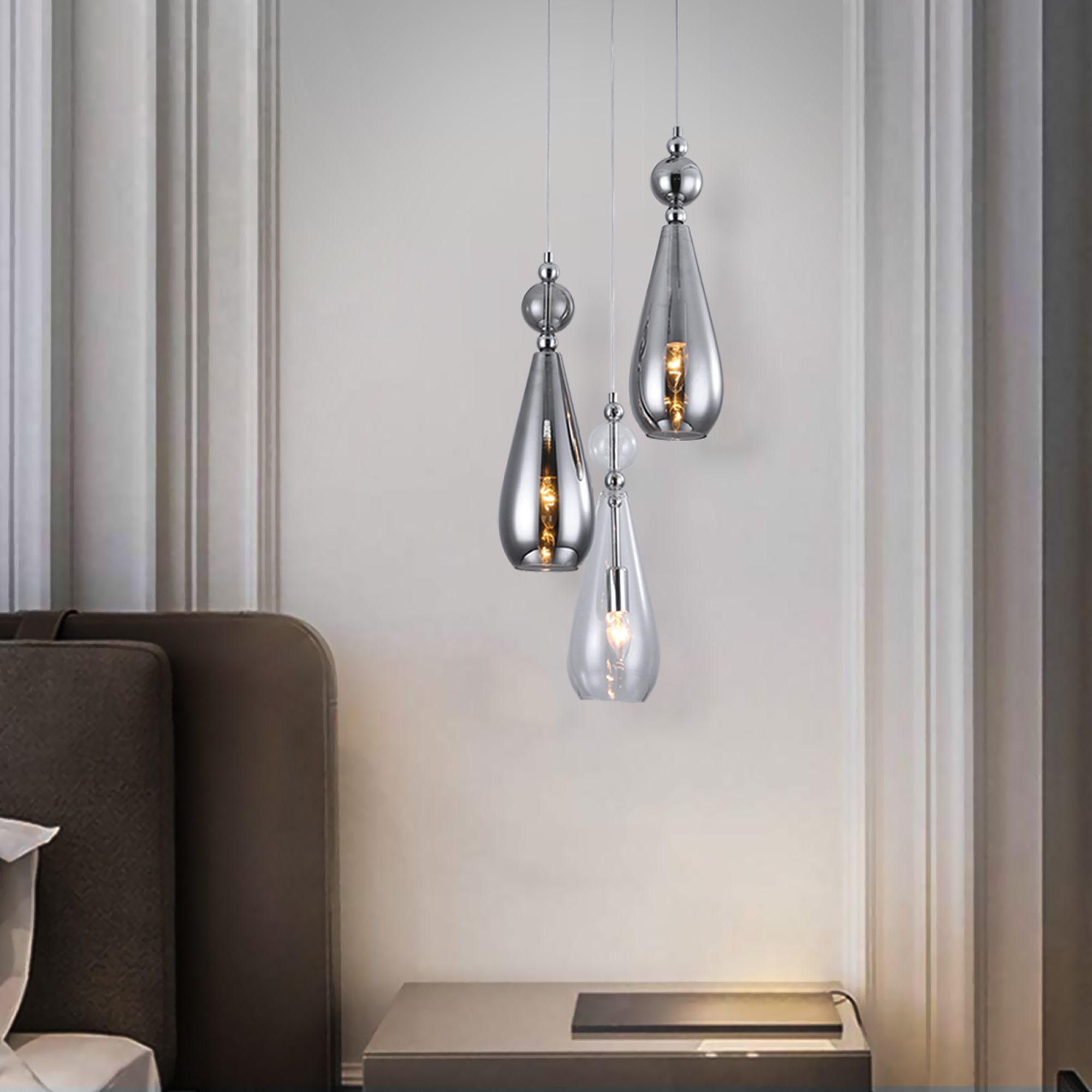 Подвесной светильник со стеклянными плафонами 50202/3 хром предназначен для создания дополнительного освещения и акцентной подсветки в современных интерьерах. Светильник со сменными лампами E14 создаст качественное освещение на площади 5 кв.м. и подсветит рабочие зоны на кухне, в гостиной, в спальне и других местах.