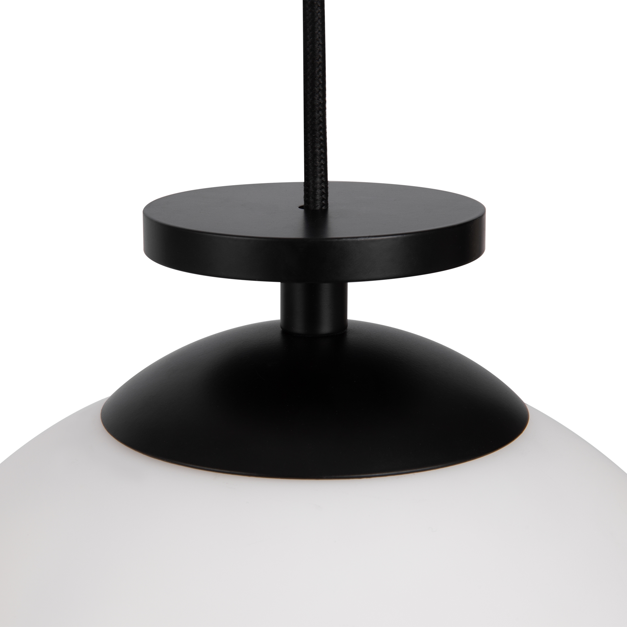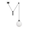Чаша крепления и элементы корпуса выполнены из металла, цвета – черный и золотой. Плафон-сфера из белого матового стекла. Специальный грузик-противовес позволяет реглуировать высоту светильника. Универсальный дизайн для пространств любых габаритов. Источник света внутри плафона – лампа с цоколем Е27.