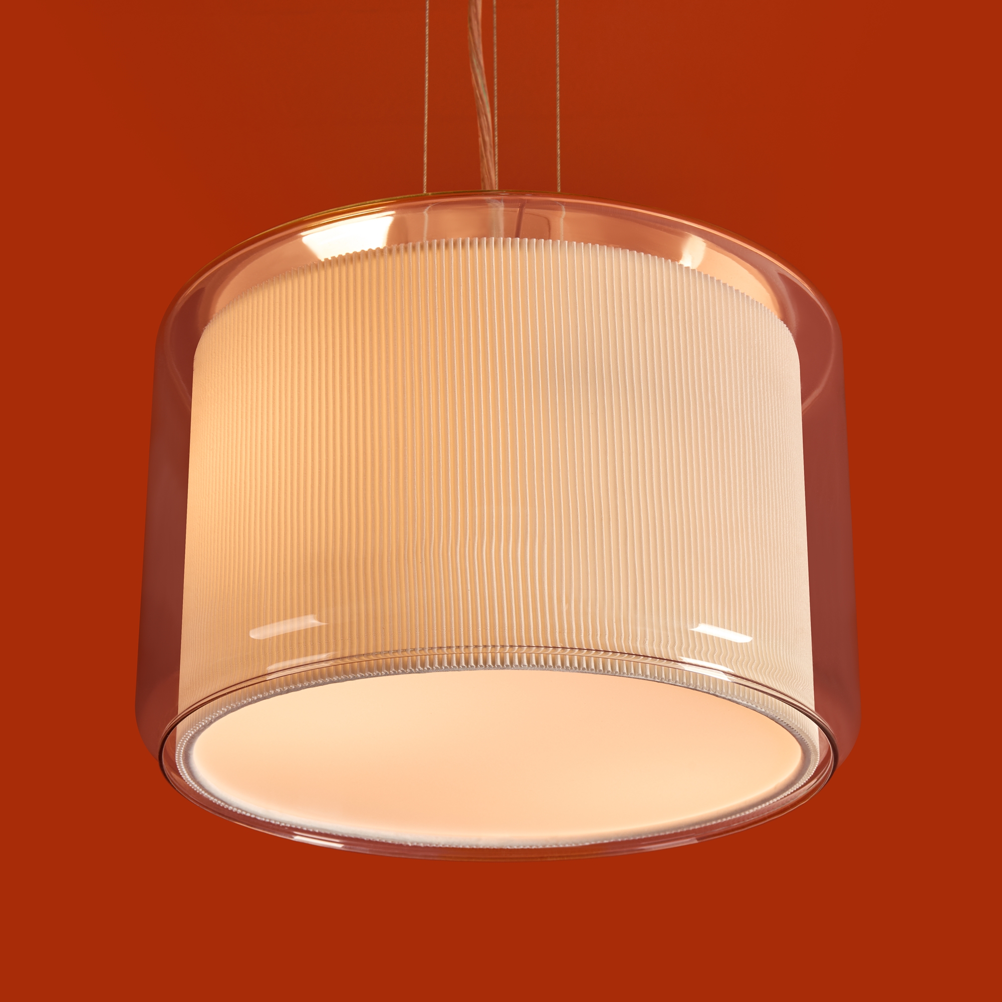 Сочетание стекла и тканевой плиссировки для мягкого рассеянного света. Лампы E27 (в комлекте). Особенность плафонов - их многослойность. В серии представлены подвесной, потолочные и настенный светильники.